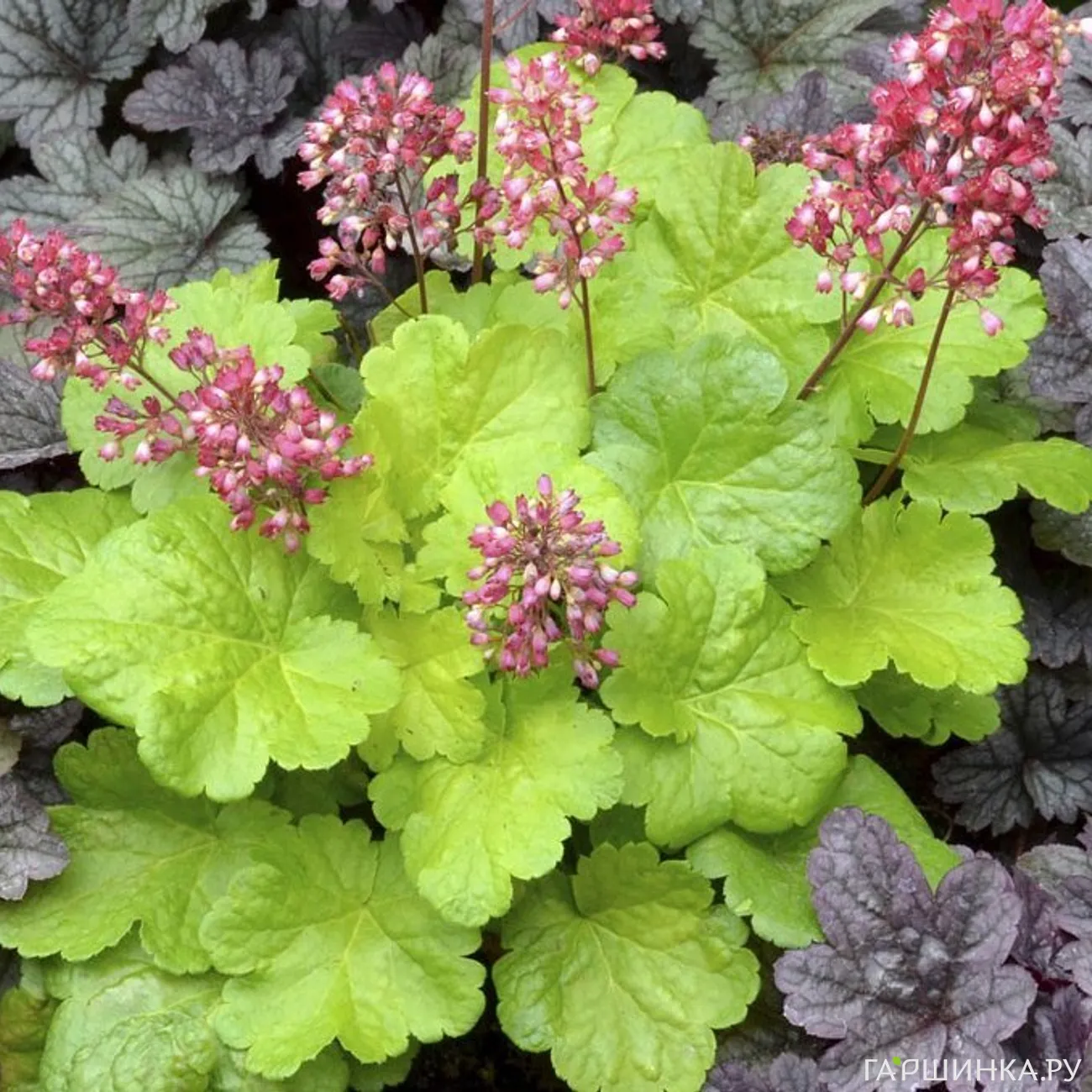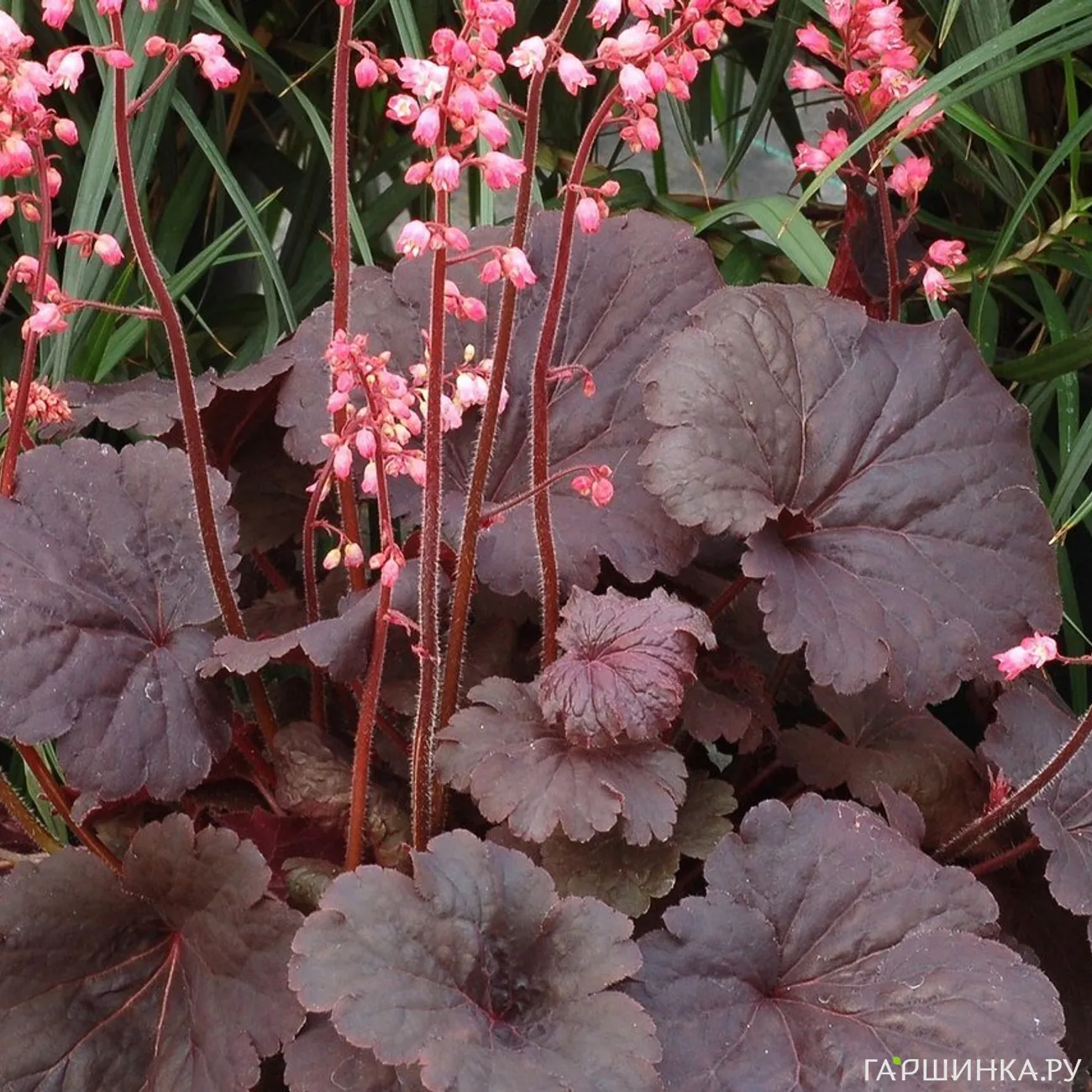 - Гейхера Литл Кьюит. Листья фиолетово-пурпурного цвета с серебряной вуалью и темными прожилками. Светло-розовые цветы на темных стеблях прекрасно смотрятся на их фоне.