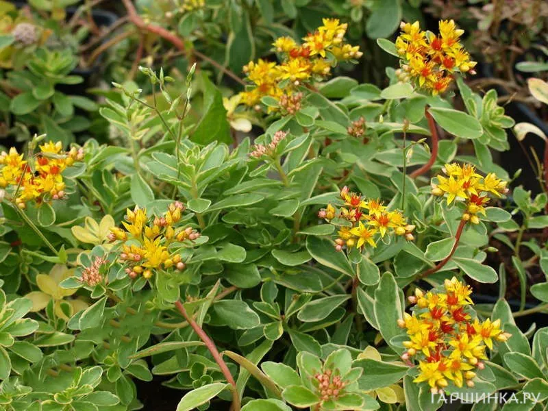 Седум отогнутый Вариегатум (Sedum Variegatum). Высота взрослого растения: 15-20 см. больше всего ценится за цвет листвы - зеленый, сизоватый, с яркой кремовой каймой. На ярком солнце кайма розовеет, получается еще более интересный трехцветный рисунок. Цветет очень обильно, весь покрываясь ярко-желтыми цветами. У молодых цветов часто встречаются оранжевые тона. Цветет в июне-июле. Зимует без укрытия.