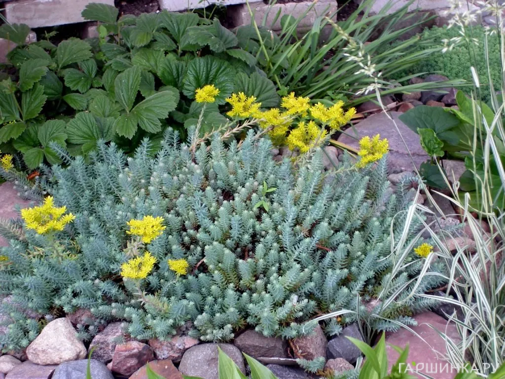 - Седум цветоносный Вейхенстефанер Голд (Sedum floriferum Weihenstephaner Gold). Быстрорастущий почвопокровный многолетник. Стебли приподнимающиеся, высотой 7-12 см. Листья сочные, толстые, зелёные, резко зубчатые на концах. Цветки крошечные, в щитковидных соцветиях, зеленовато-жёлтые распускаются в июне-июле.
