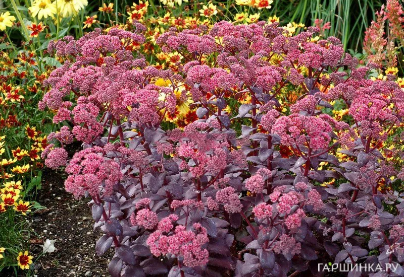 - Очиток видный Осенняя радость. Быстрорастущий многолетник. Вертикальные побеги высотой 30-60 м образуют большие куртинки. Листья продолговатые, зубчатые, блестящие. Эффектные темно-розовые соцветия подчеркивают красоту листвы. Цветет с июля по сентябрь.