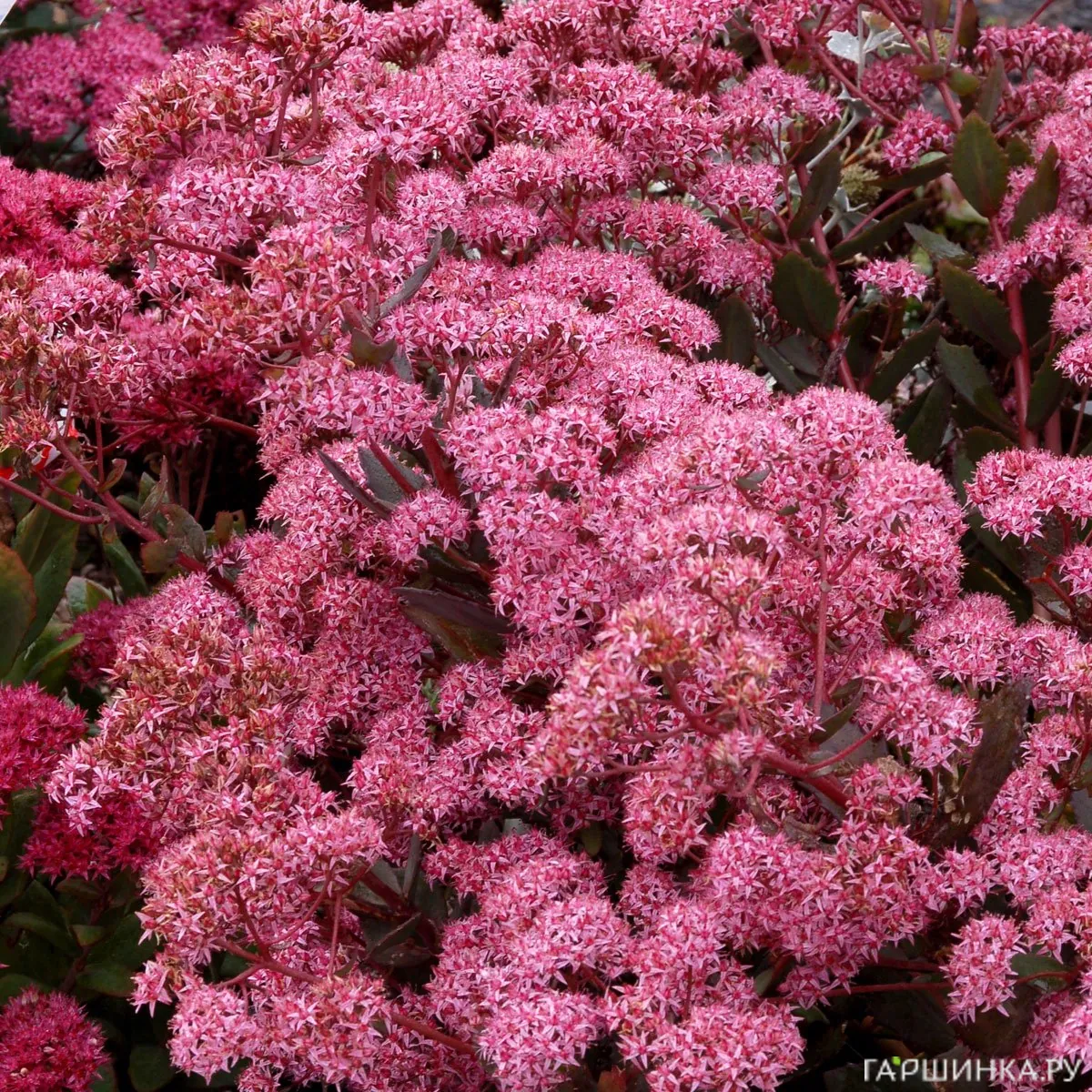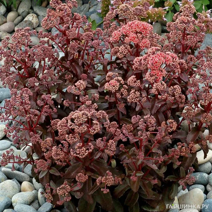 - Седум Черри Траффл (Sedum Cherry Truffle). Весной покрытый многочисленными пурпурными, красными и коричневыми листиками, в летнее время он полностью окрашивается в глубокий шоколадный цвет. На концах побегов распускаются щитковидные соцветия с розовыми цветками. Разрастается этот седум достаточно быстро. Его стебли растут вверх и устойчивы к полеганию. Куст компактного размера. Его высота без цветоносов достигает 40, а в ширину разрастается до 60 см.
