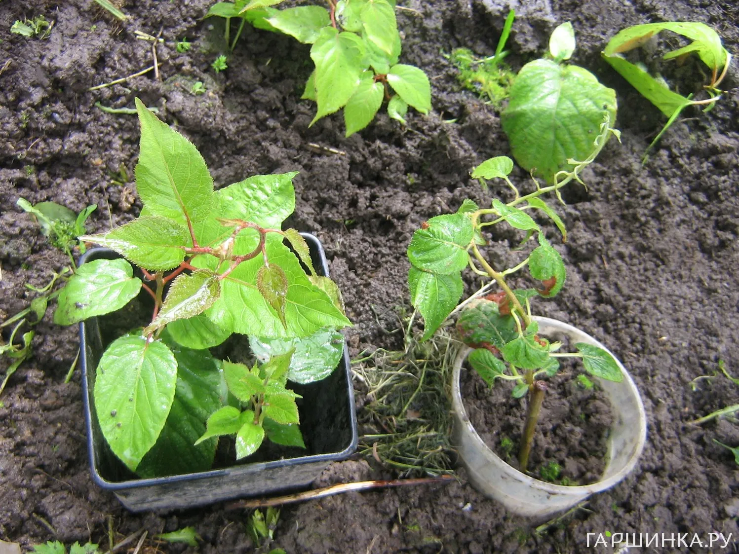 Для посадки актинидии готовят лунки диаметром и глубиной чуть более полуметра, на дно которых выкладывают дренаж из керамзита, битых кирпичей или гравия и засыпают садовую землю, перемешанную с удобрениями: в одну посадочную яму вносят по ведру перегноя, стакану суперфосфата и по 60 – 70 граммов аммиачной селитры и калийной соли. На холмик внутри лунки размещают саженец, стараясь не повредить земляной ком вокруг его корневой системы. Аккуратно утрамбовав землю после посадки и следя за тем, чтобы корневая шейка не оказалась ниже уровня почвы, саженец поливают и тщательно мульчируют землю вокруг него. Расстояние между саженцами составляет от метра до двух в зависимости от вида актинидии, определяющего его будущий размер. Мужские
