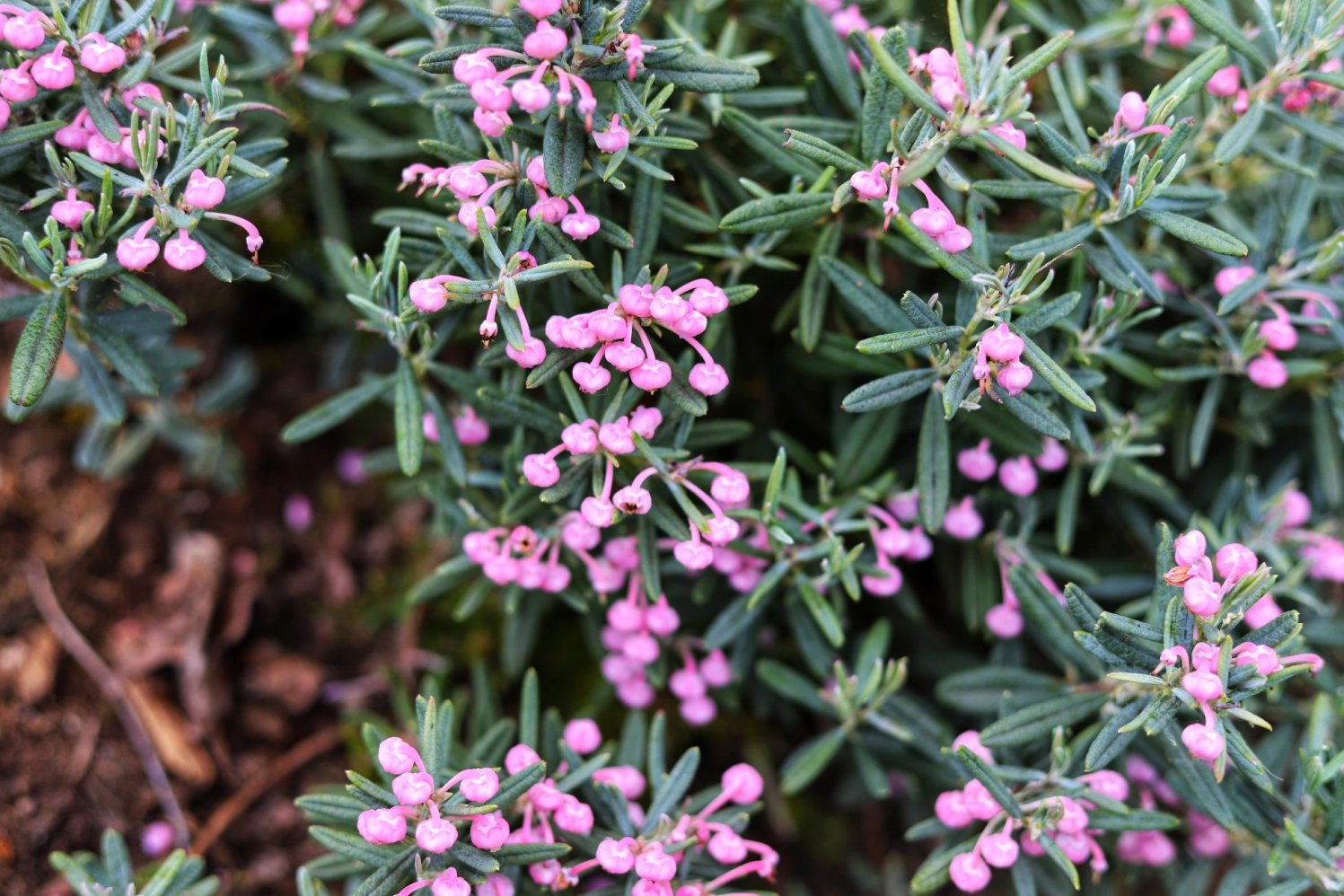 Куст невысокий — всего 20–40 см, с густыми побегами, формирующими аккуратную подушку. Листья узкие, кожистые, сверху блестящие, снизу голубовато-серые благодаря восковому налёту. Весной куст покрывается множеством розовых колокольчиков, собранных в поникающие соцветия. Цветение продолжается до месяца, придавая саду особое очарование.