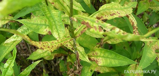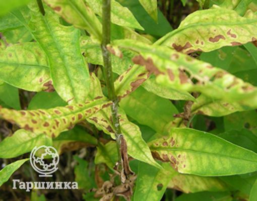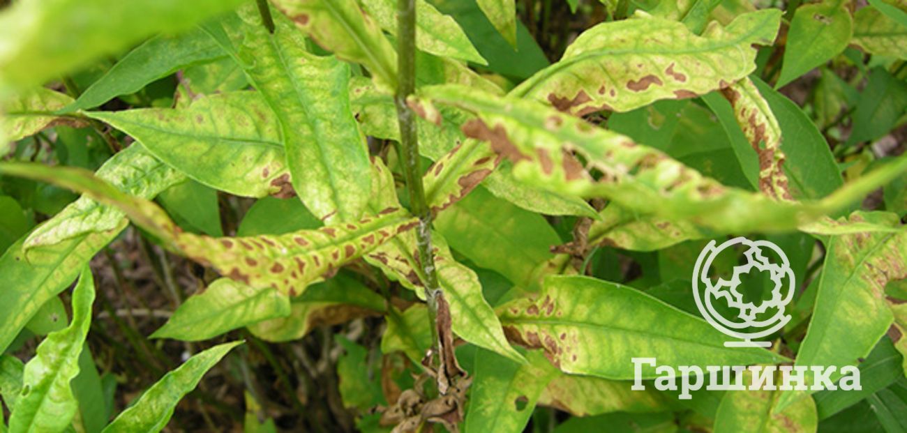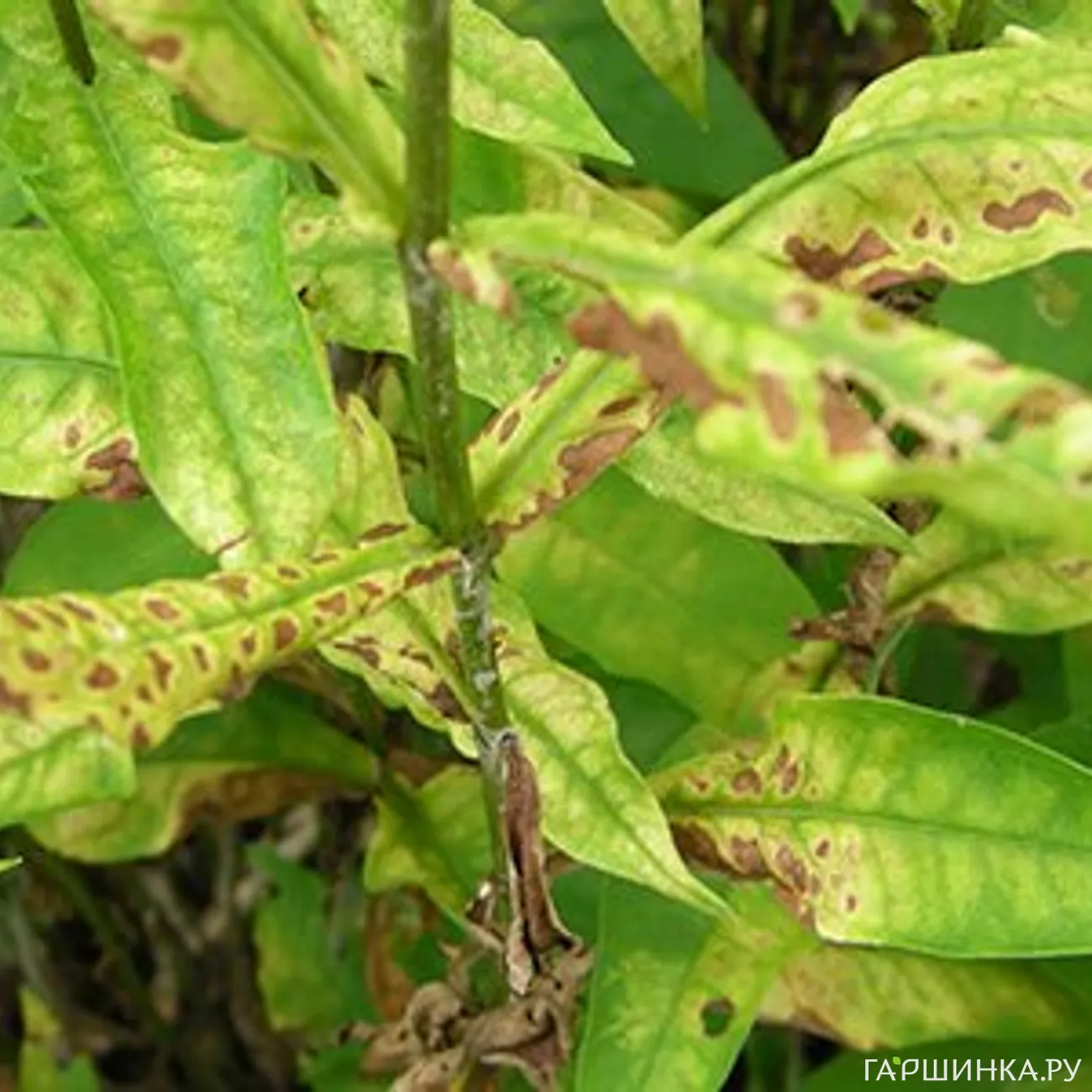 - БЕЛАЯ ПЯТНИСТОСТЬ и РЖАВЧИНА – схожие болезни. На листьях появляются белые или коричневатые пятна, растения истощаются, нижние листья высыхают.