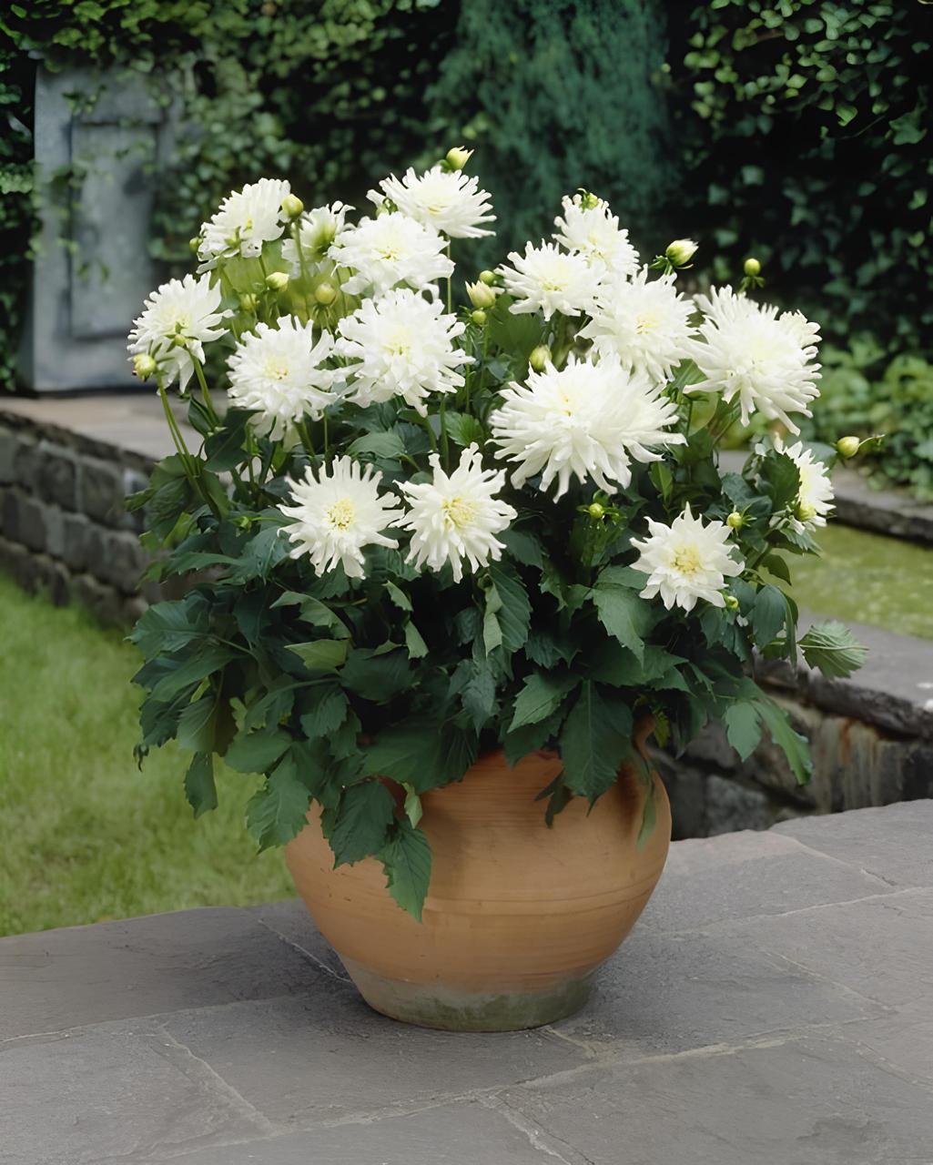 Контейнерные посадки позволяют использовать георгины даже там, где нет возможности разбить полноценный цветник. В горшках растения сохраняют компактность, быстро формируют куст и цветут столь же обильно, как и в грунте. Мобильность контейнеров помогает легко менять композиции: переносить горшки к зоне отдыха, группировать их у террасы или расставлять по ступеням.