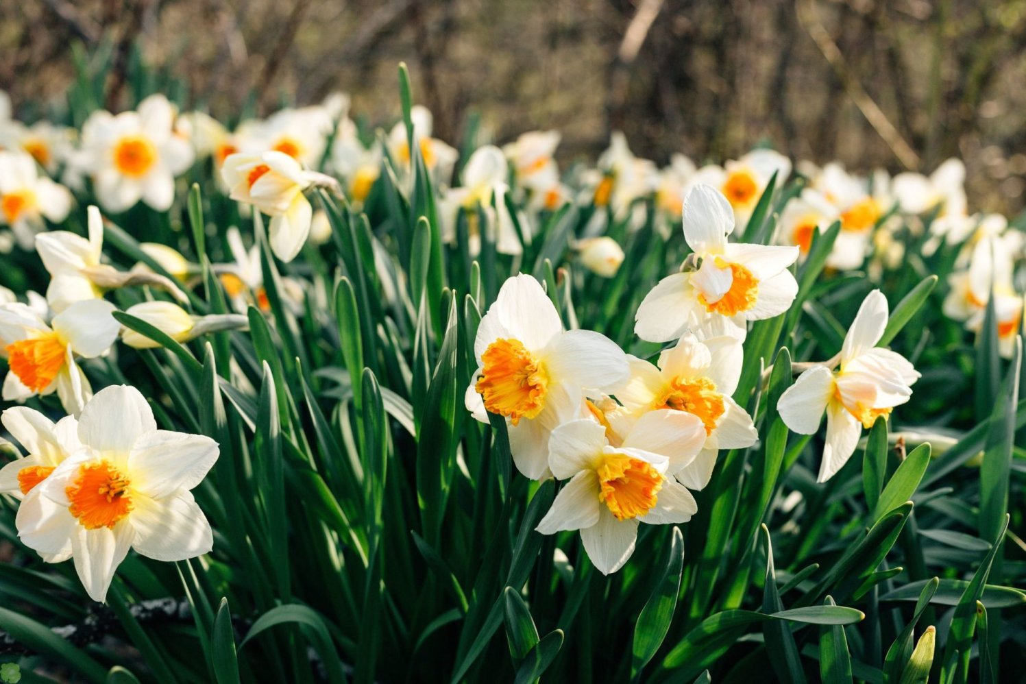 Парад цветения нарциссов приходится на самое начало мая, однако разные сорта культуры имеют разные сроки цветения: если создать яркую монокомпозицию из таких сортов, можно любоваться их цветением почти на протяжении месяца. Культура не требует ежегодной выкопки, но спустя 3 или 4 года после первой посадки луковиц лучше рассадить растения, которым становится тесно. Кроме того, выкапывание луковиц даст множество качественного посадочного материала. Особенной декоративностью обладают махровые и корончатые сорта луковичного многолетника, основная палитра раскрасок огромного разнообразия видов нарциссов состоит из множества оттенков золотых, лимонных, палевых, персиковых, апельсиновых оттенков, чаще всего оттенённых безупречной белизной.