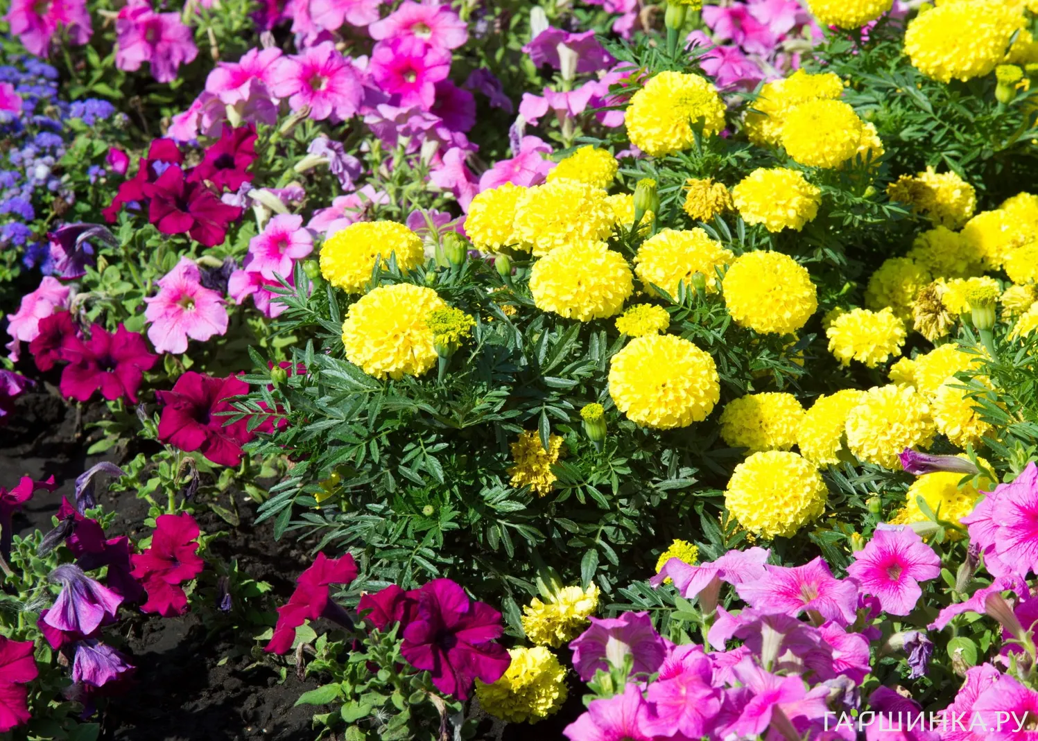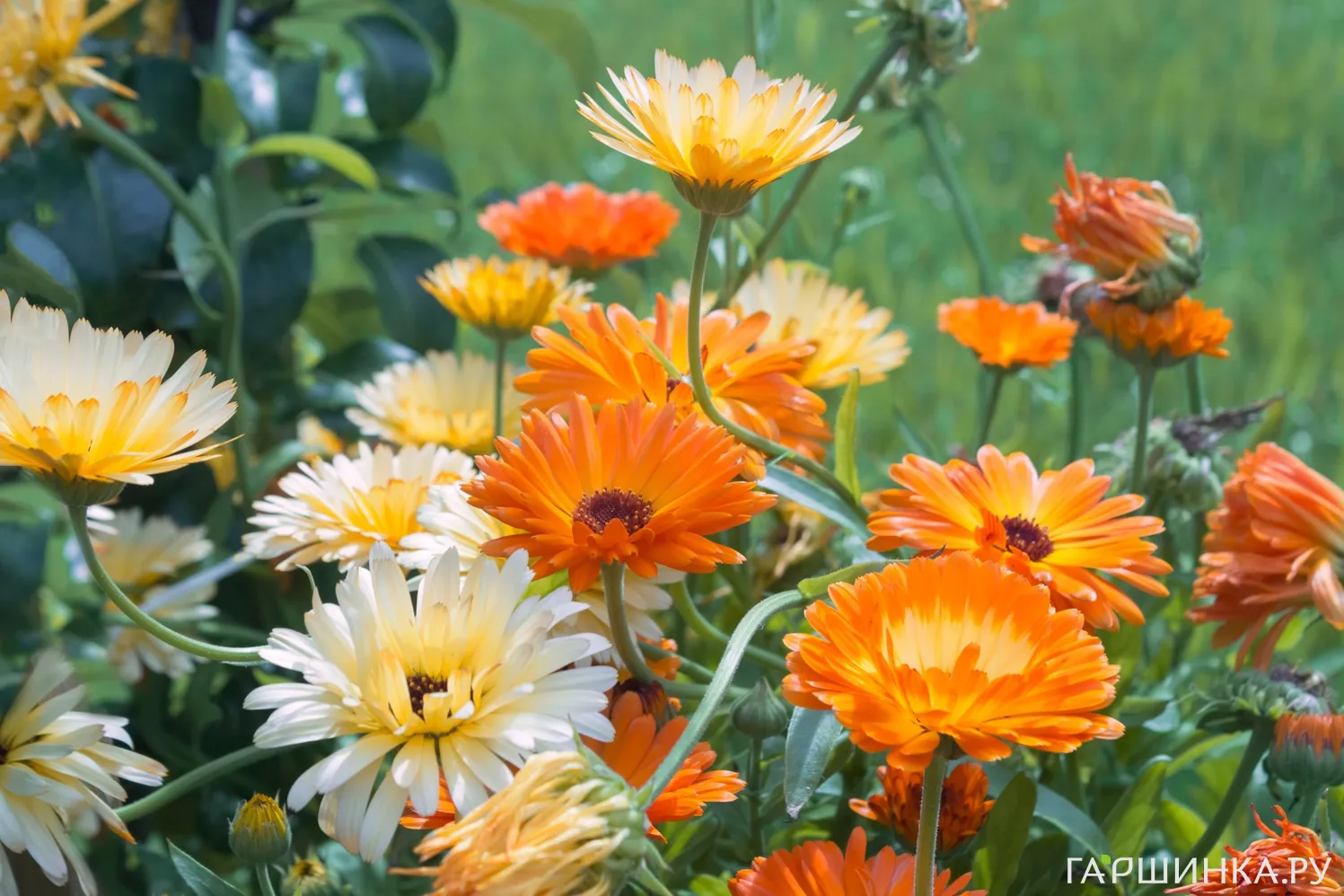 Календула, или ноготки, известна своими лечебными свойствами и яркими цветами оттенков желтого и оранжевого. Среди популярных сортов выделяют 'Фиеста Гитана', 'Радио' и 'Калипсо', которые отличаются махровостью и размером цветков.