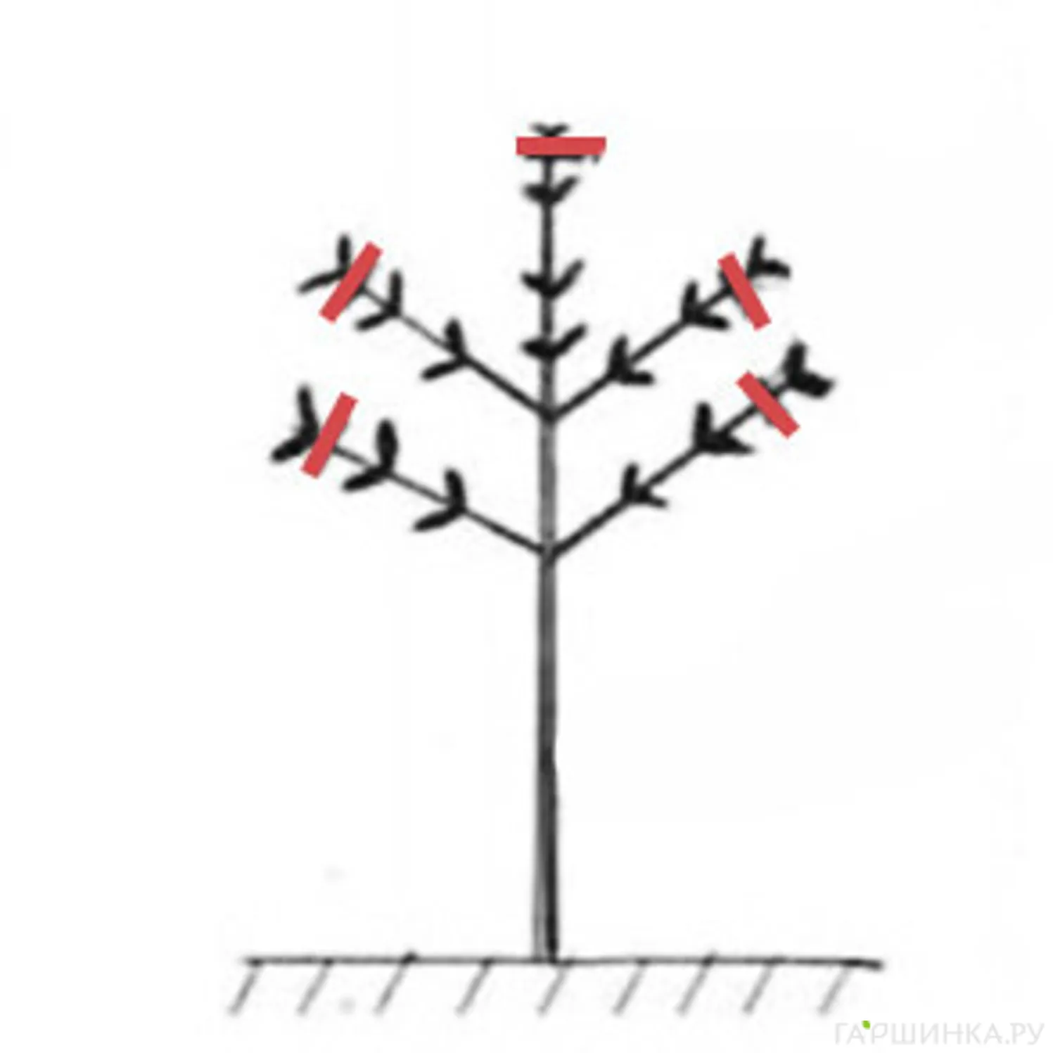 В начале вегетационного периода «на кольцо» вырезаем боковые побеги. Главный побег прищипывается. В летний период «на кольцо» вырезаются боковые побеги до первого узла скелетных ветвей кроны. Побеги кроны прищипываются.
