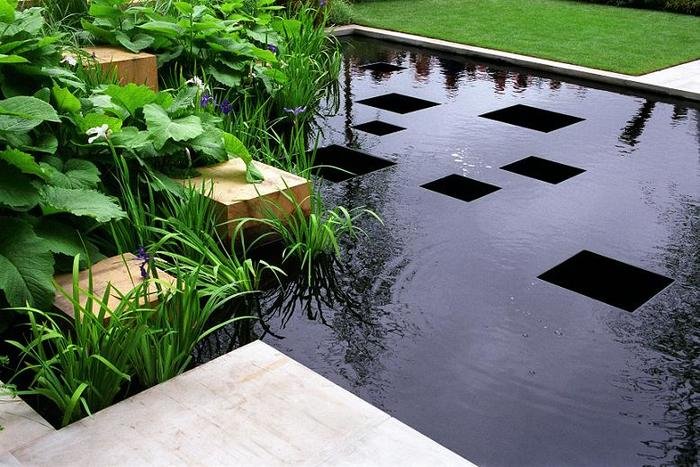 - При оформлении сада в стиле модерн обязательно включение в общую планировку водного объекта, причём стоит иметь в виду, что установка претенциозного фонтана нарушит умиротворяющие очертания садового стиля, зато компактный фонтан способен спасти композицию. Пожалуй, оптимальным вариантом садовой водной стихии станет искусственный пруд, озерцо или бассейн. Очертания садового водоёма обычно повторяют плавные изгибы садовых дорожек и даже растительный орнамент кованых деталей. Вблизи бассейна или озера можно оборудовать небольшую площадку для спокойного релакса на лоне природы, сопровождающегося ласковым журчанием водопада или шёпота фонтана. А если дополнить имеющийся водоём небольшой клумбой, на которой высажены любимые цветочки, это место будет самым популярным уголком в саду модерн.