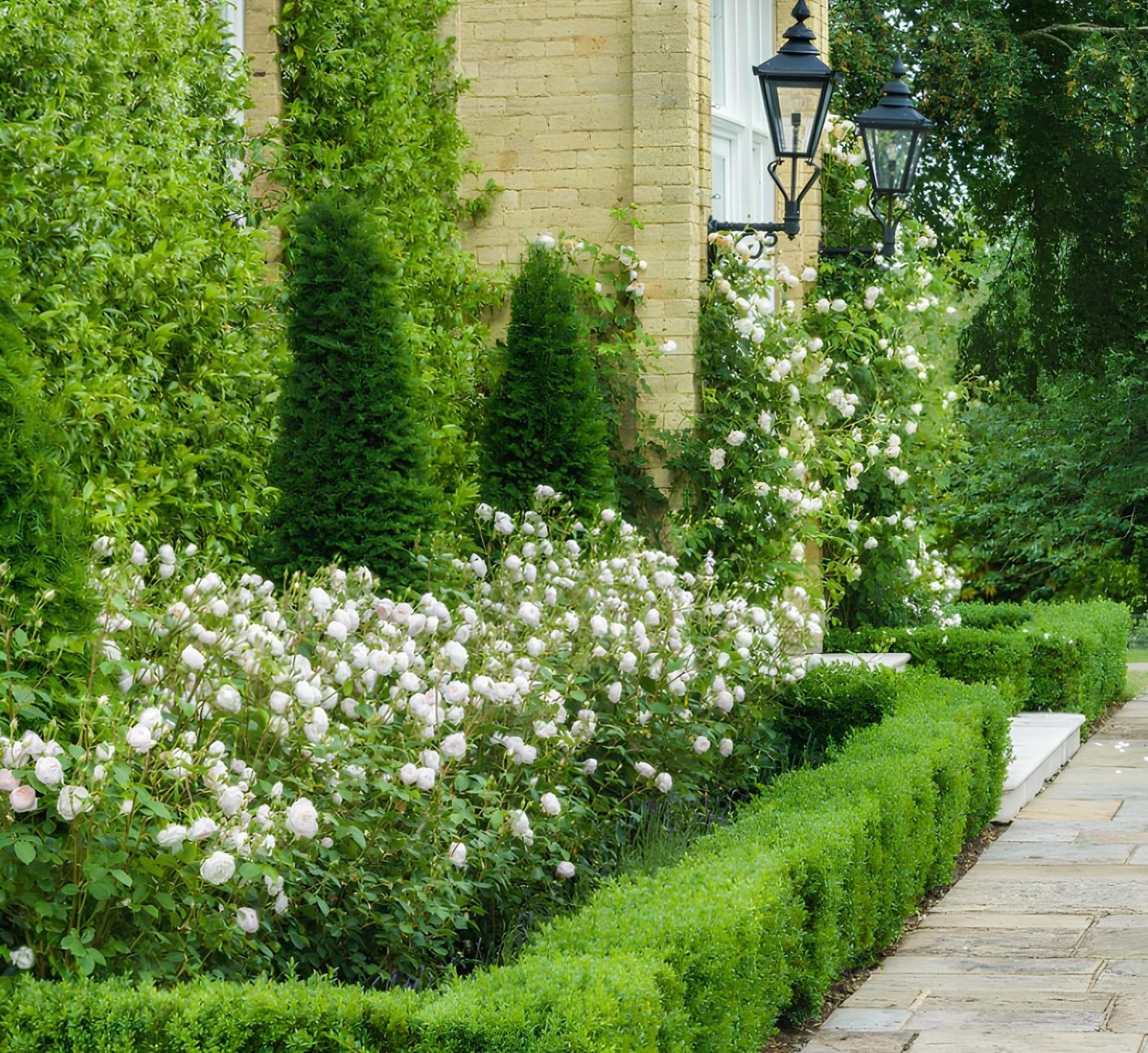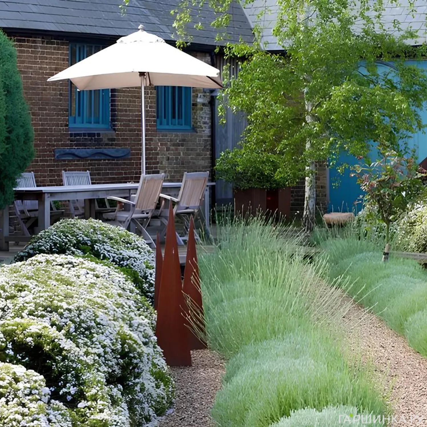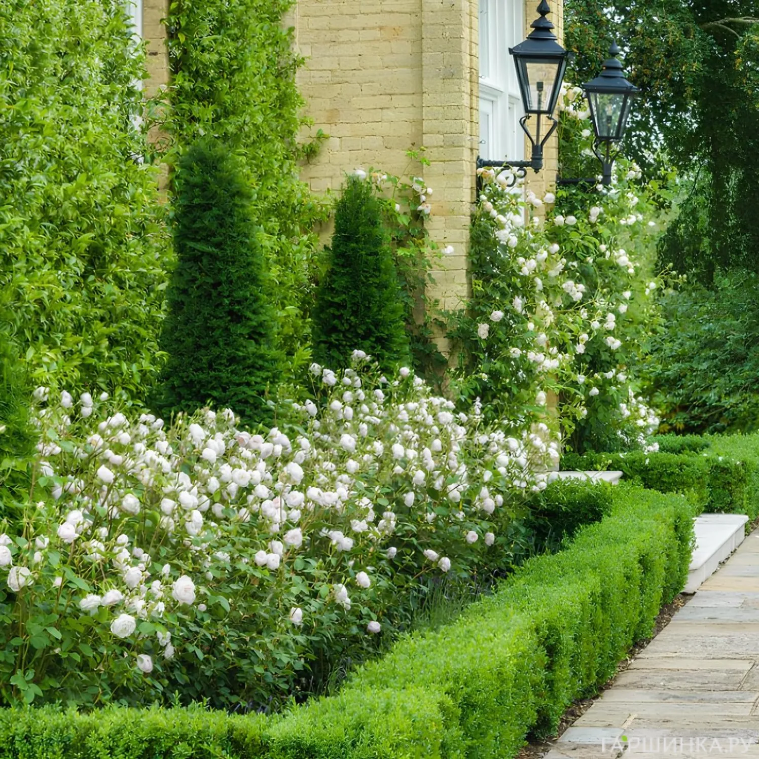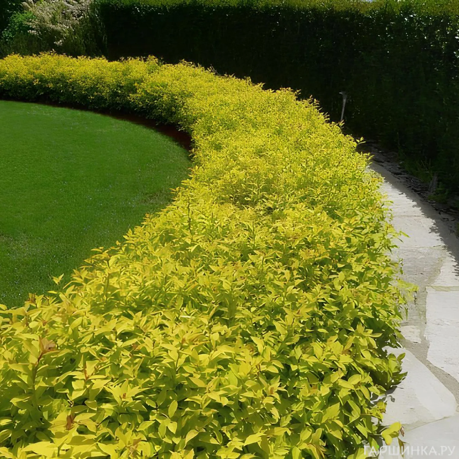 Кустарники используют для создания более строгих и выразительных бордюров. Они подходят для парадных зон, регулярных садов и участков, где важна чёткая линия посадки. Такие бордюры выглядят основательно и сохраняют форму на протяжении многих лет.
