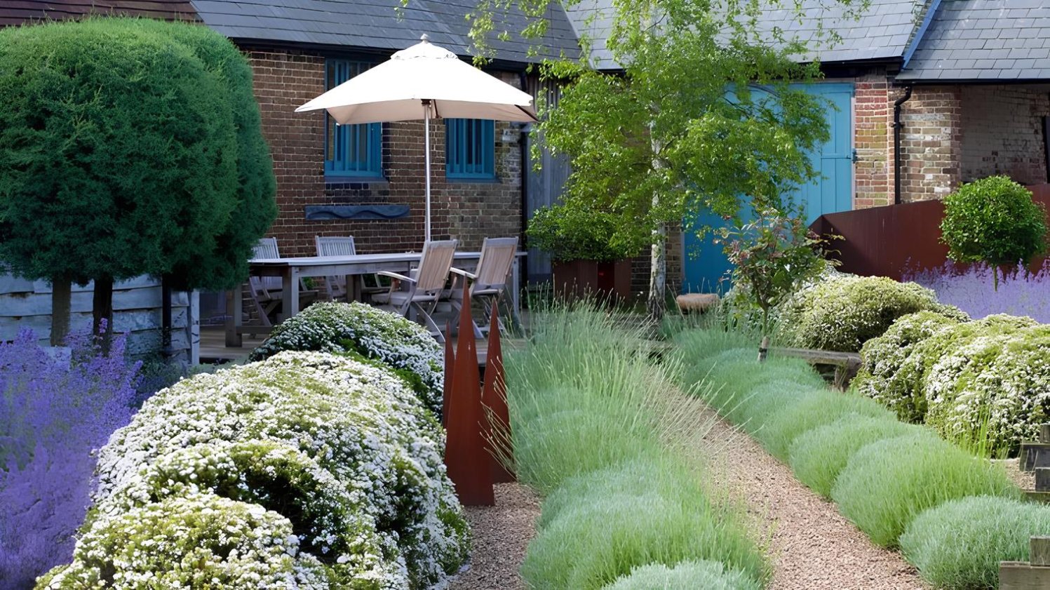 Растительный бордюр подчёркивает линии дорожек, аккуратно отделяет цветники от газона, помогает структурировать пространство и придаёт композициям завершённый вид. В отличие от камня, бетона или пластика, живой бордюр выглядит естественно, мягко вписывается в окружение и со временем становится полноценной частью сада. Такой приём одинаково уместен как в регулярных садах с чёткой геометрией, так и в пейзажных композициях.