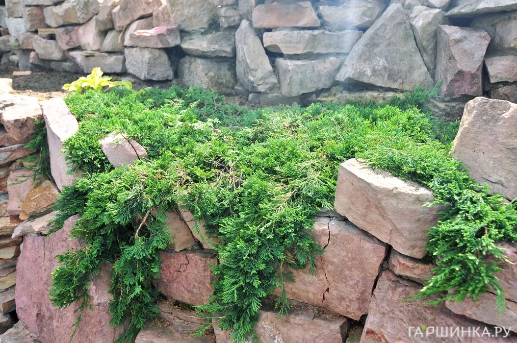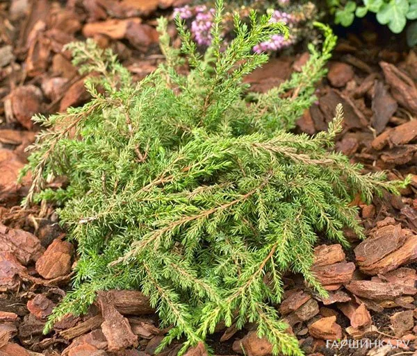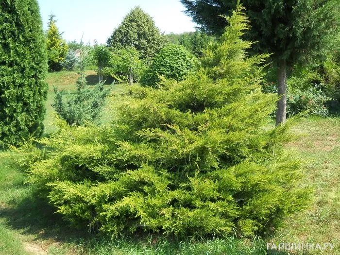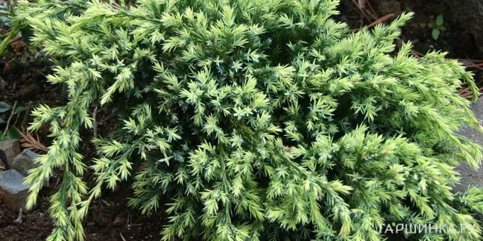 - Можжевельник средний – растение распростертой формы с поникающими дуговидными побегами. Хвоя чешуйчато-игловидная, острая, различных оттенков зеленого. Подходит для альпийских горок и рокариев, озеленения склонов.