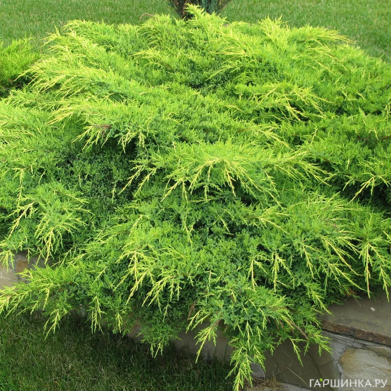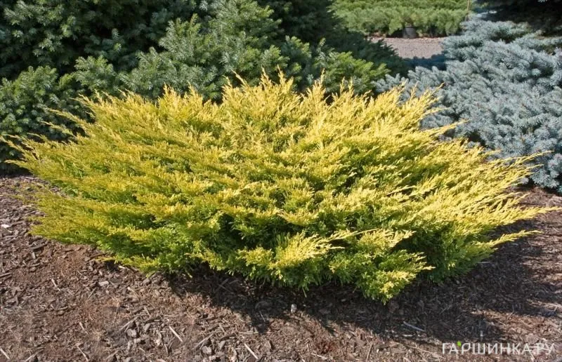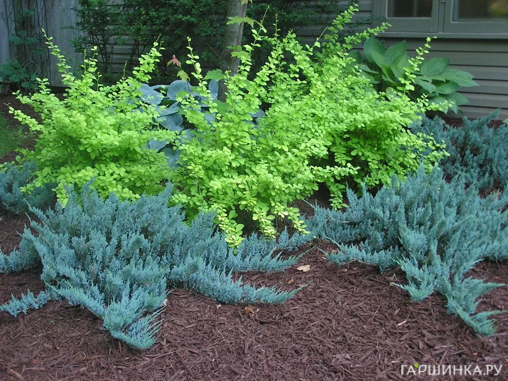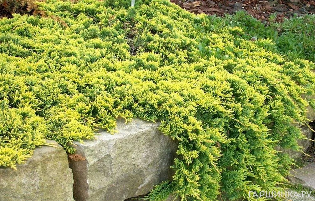 - Можжевельник горизонтальный – один из представителей стелющихся можжевельников. Высота от 10 до 50 см, в ширину простирается от 1,5 до 2 м. Растет медленно, ежегодно прибавляя 5-10 см. Окраска может быть зеленой, серовато-зеленой, серебристой, голубой, ярко-желтой, однотонной или двуцветной. В ландшафтном дизайне можжевельник горинонтальный используется для оформления склонов, каменистых горок и бордюров.