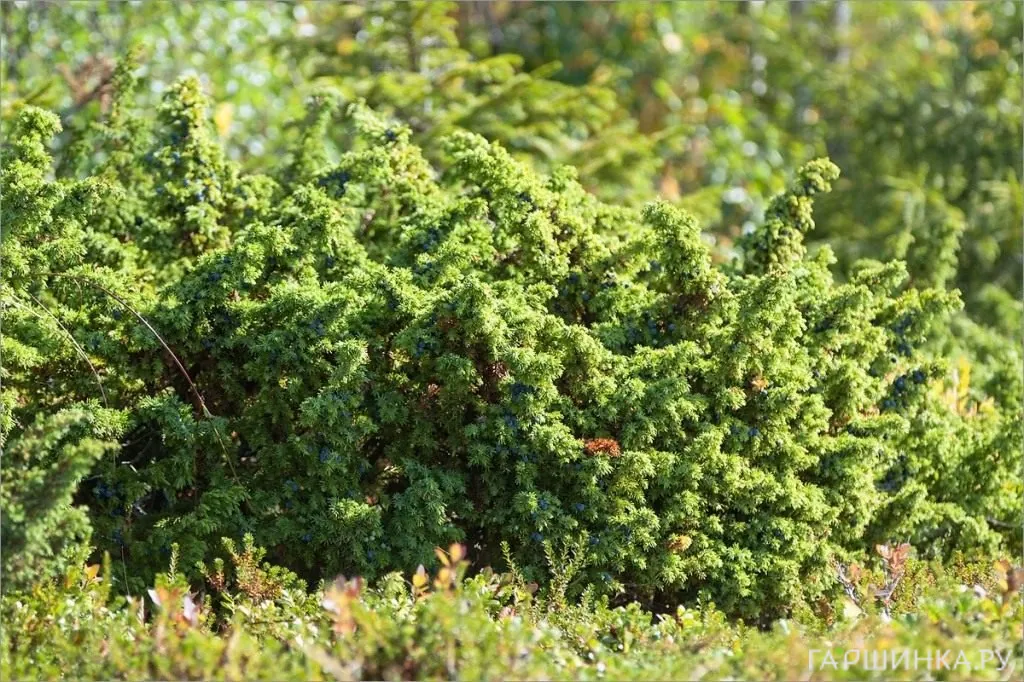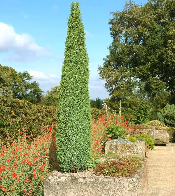 - Можжевельник обыкновенный – высокорослый раскидистый кустарник. Хвоя игловидная, колючая, с сизоватым оттенком. Имеет колонновидные формы, используемые для создания живых изгородей, карликовые – для альпийских горок.