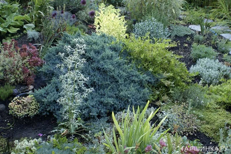 - Можжевельник чешуйчатый – может иметь древовидную и стелющуюся формы. Хвоя жесткая, серебристо-голубая. Подходит для альпийских горок и рокариев, озеленения склонов.