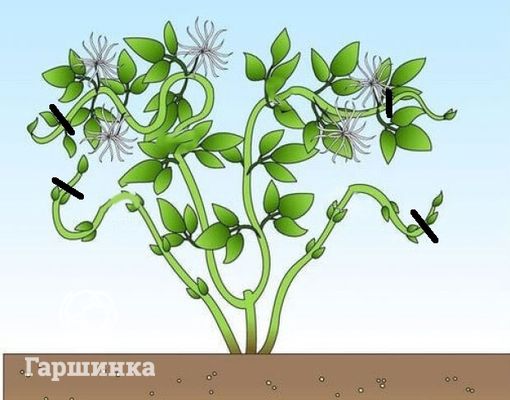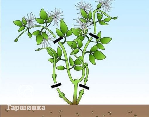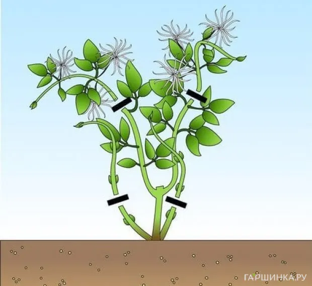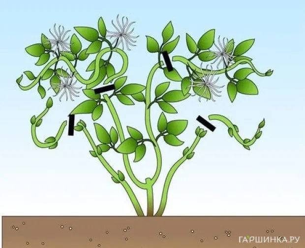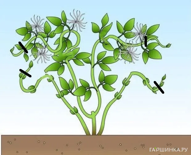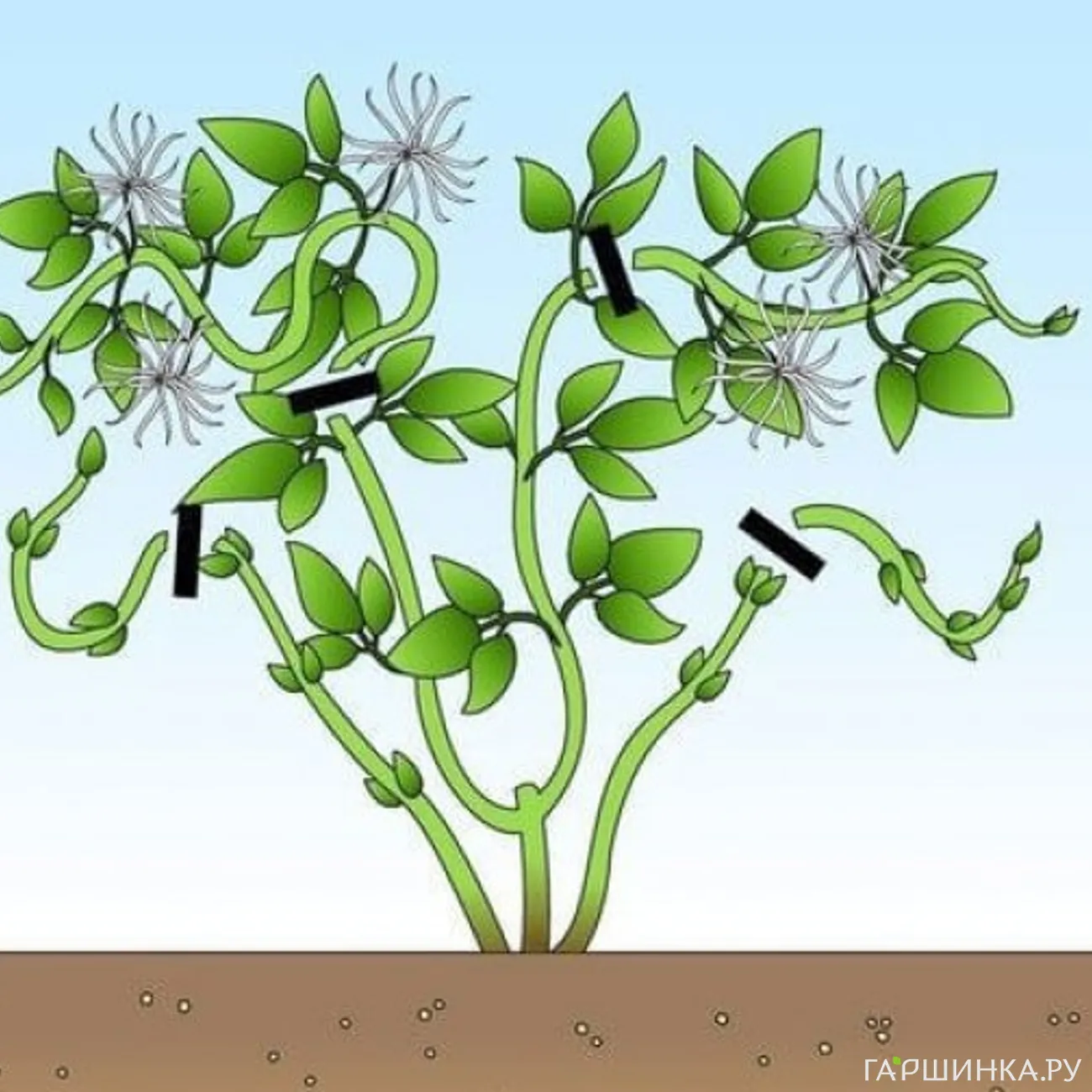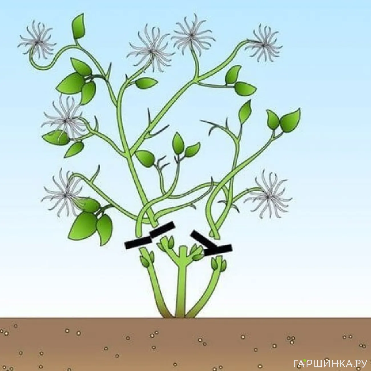 - Кроме того, существует универсальный способ обрезки, когда побеги обрезаются, условно говоря, через один: один на пенек, у другого подрезается только верхушка. Этот прием является даже полезным, ведь в результате происходит омоложение кустов. Да и цветки у таких растений будут располагаться равномерно по всей поверхности лианы.