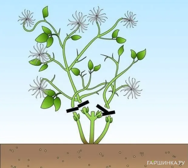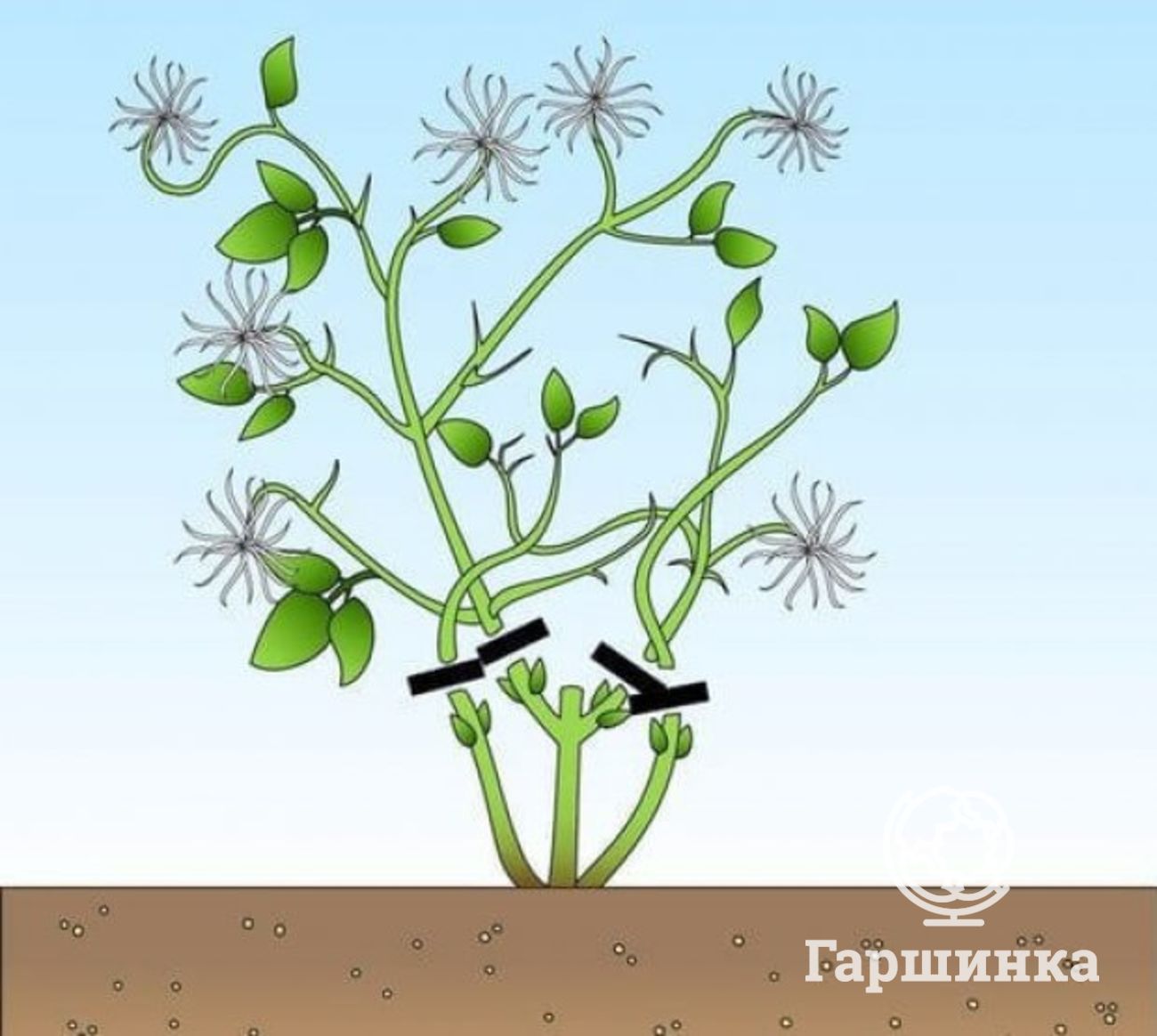 - Клематисы третьей группы обрезки цветут на молодых побегах, отрастающих весной, поэтому им нужна кардинальная обрезка. Над уровнем почвы оставляют лишь пеньки высотой 10-15 см с 2-3 почками.