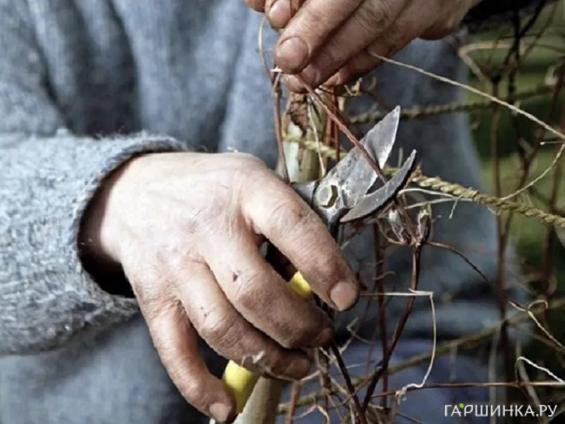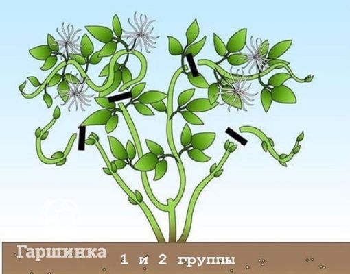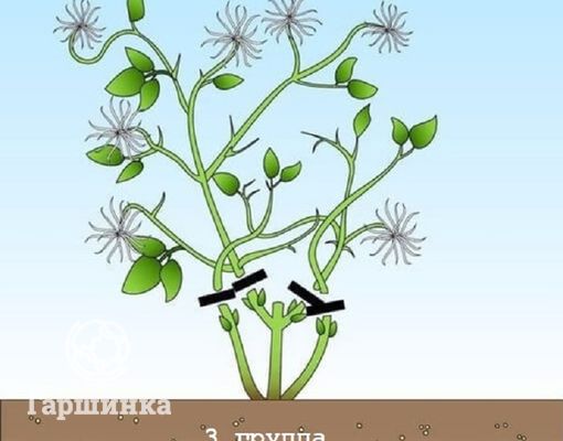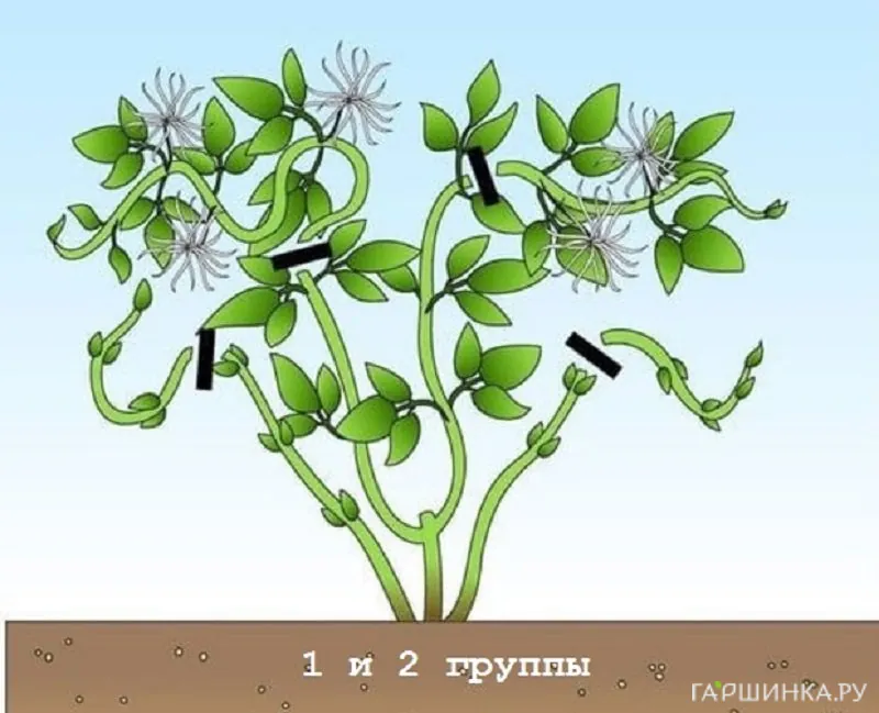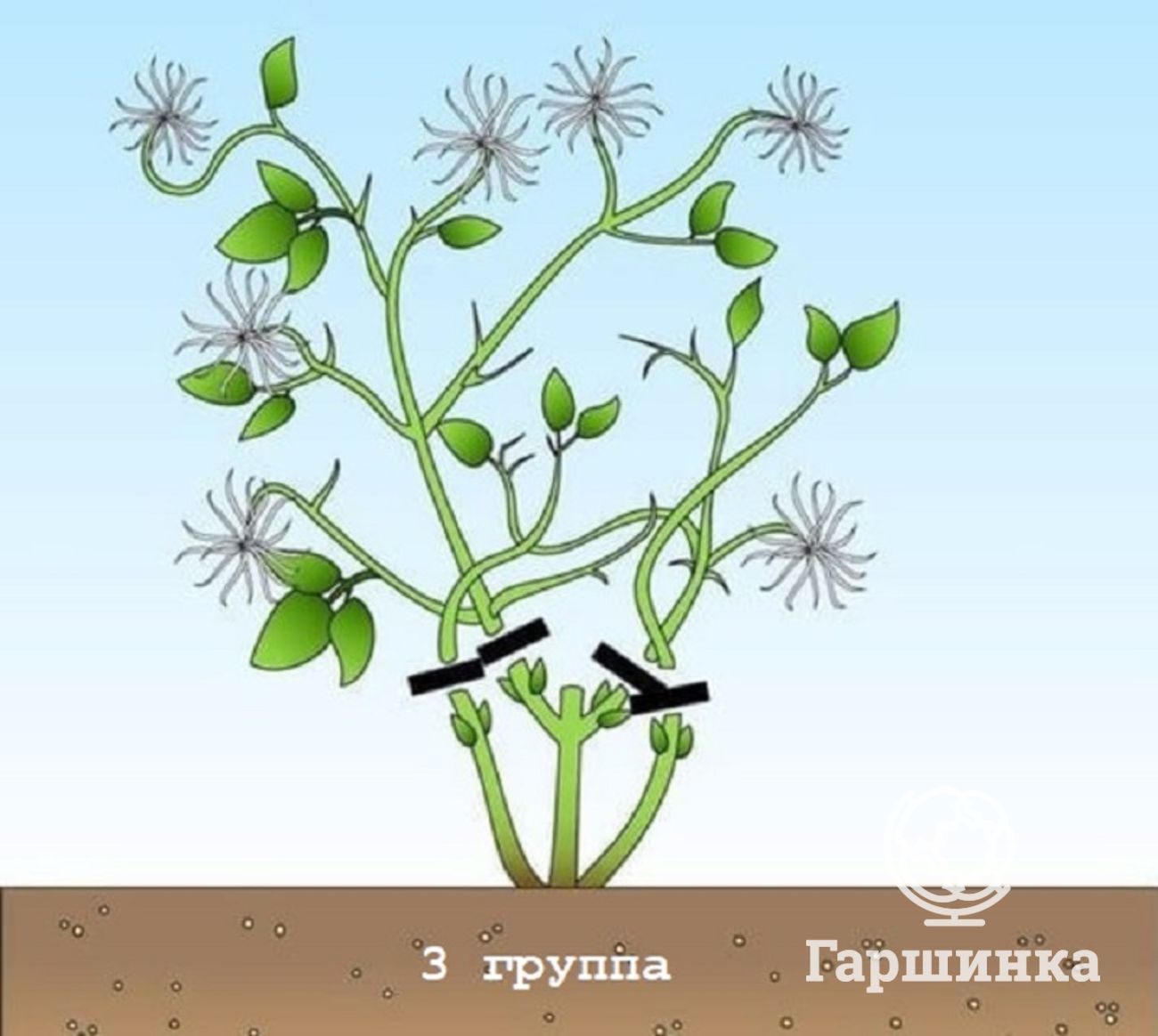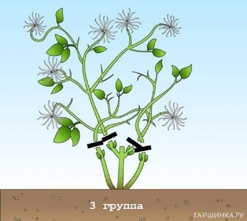 В последующие годы обязательно удаляются все сухие, больные, загущающие побеги, затем проводится непосредственно предзимняя обрезка. Техника обрезки зависит от того, к какой группе по характеру цветения принадлежит лиана, а их выделяют три: