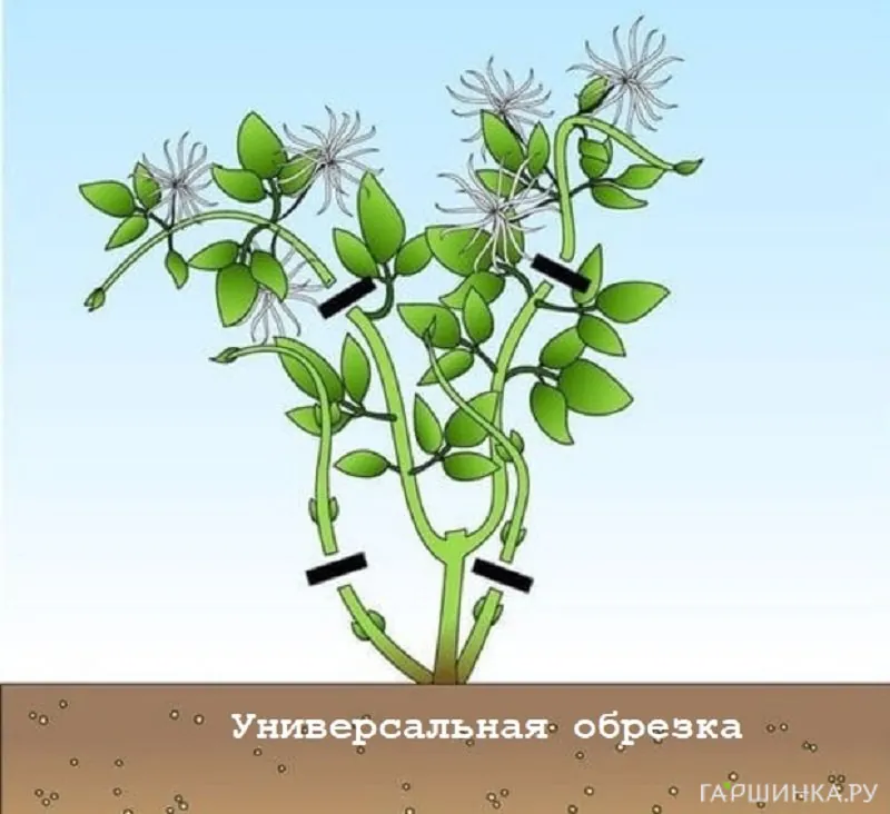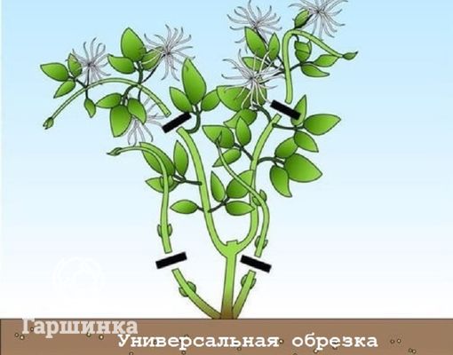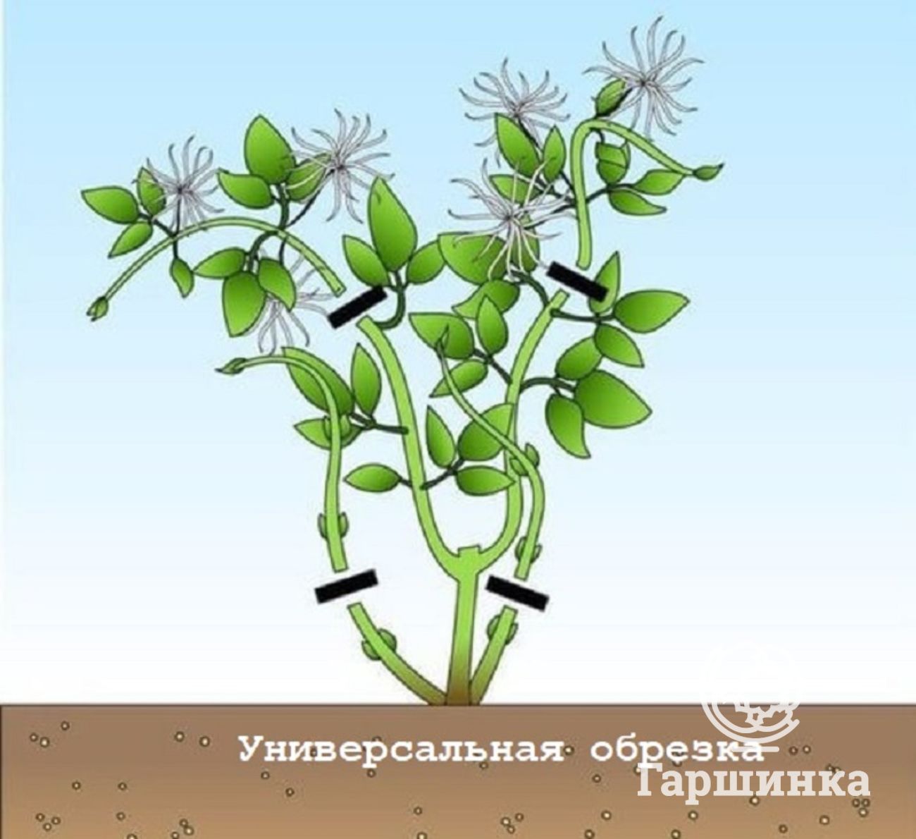 Кроме того, существует универсальный способ обрезки, когда побеги обрезаются, условно говоря, через один: один на пенек, у другого подрезается только верхушка. Этот прием является даже полезным, ведь в результате происходит омоложение кустов. Да и цветки у таких растений будут располагаться равномерно по всей поверхности лианы.