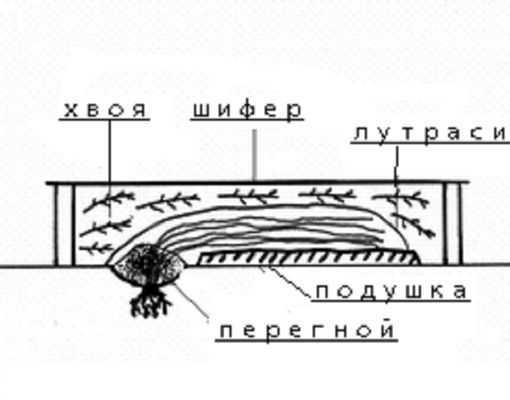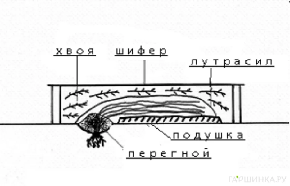 Укрытие клематисов 1 и 2 групп. На земле формируют подложку из лапника, сухих листьев или хвороста. На них укладывают скрученные кольцом побеги и оборачивают их укрывным материалом (спанбондом, агротексом или лутрасилом). Сверху укладываю слой сухих листьев или лапника, и дополнительно защищают от влаги шифером или рубероидом. Нежелательно использование пленки: она препятствует воздухообмену, а в ясные дни дает резкие перепады температур, нагреваясь днем и быстро остывая ночью.