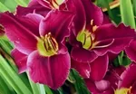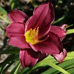 Фиолетово-пурпурный цветок с бархатистыми лепестками, имеющими волнистое окаймление и центральную продольную светлую полосу. Маленькое горло цветка фисташково-лимонного оттенка. Морозостойкий сорт средне-позднего срока цветения, начинающий распускать бутоны в июле – августе, всегда привлекает к себе внимание.