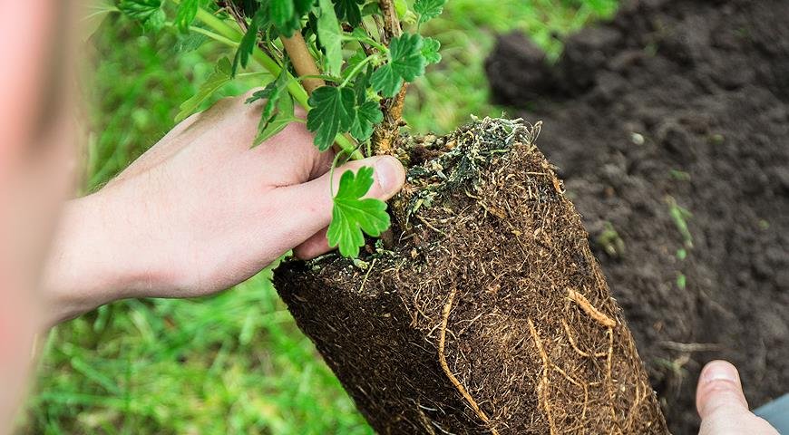 - Перед посадкой на саженцах крыжовника удаляют засохшие и обломанные побеги, укорачивают излишне длинные корни. Подсохшую корневую систему можно замочить на сутки, добавив в виду препараты, стимулирующие корнеобразование.