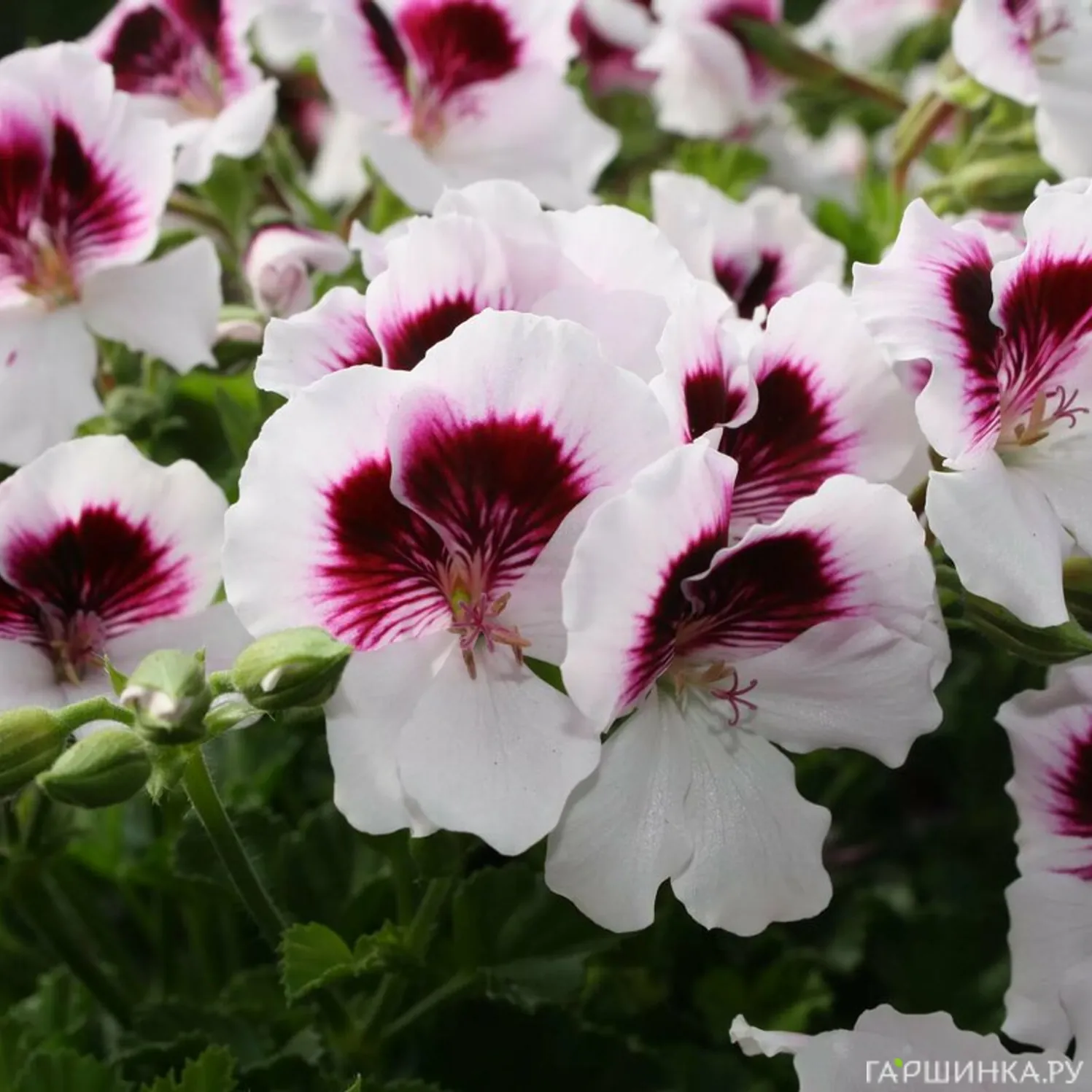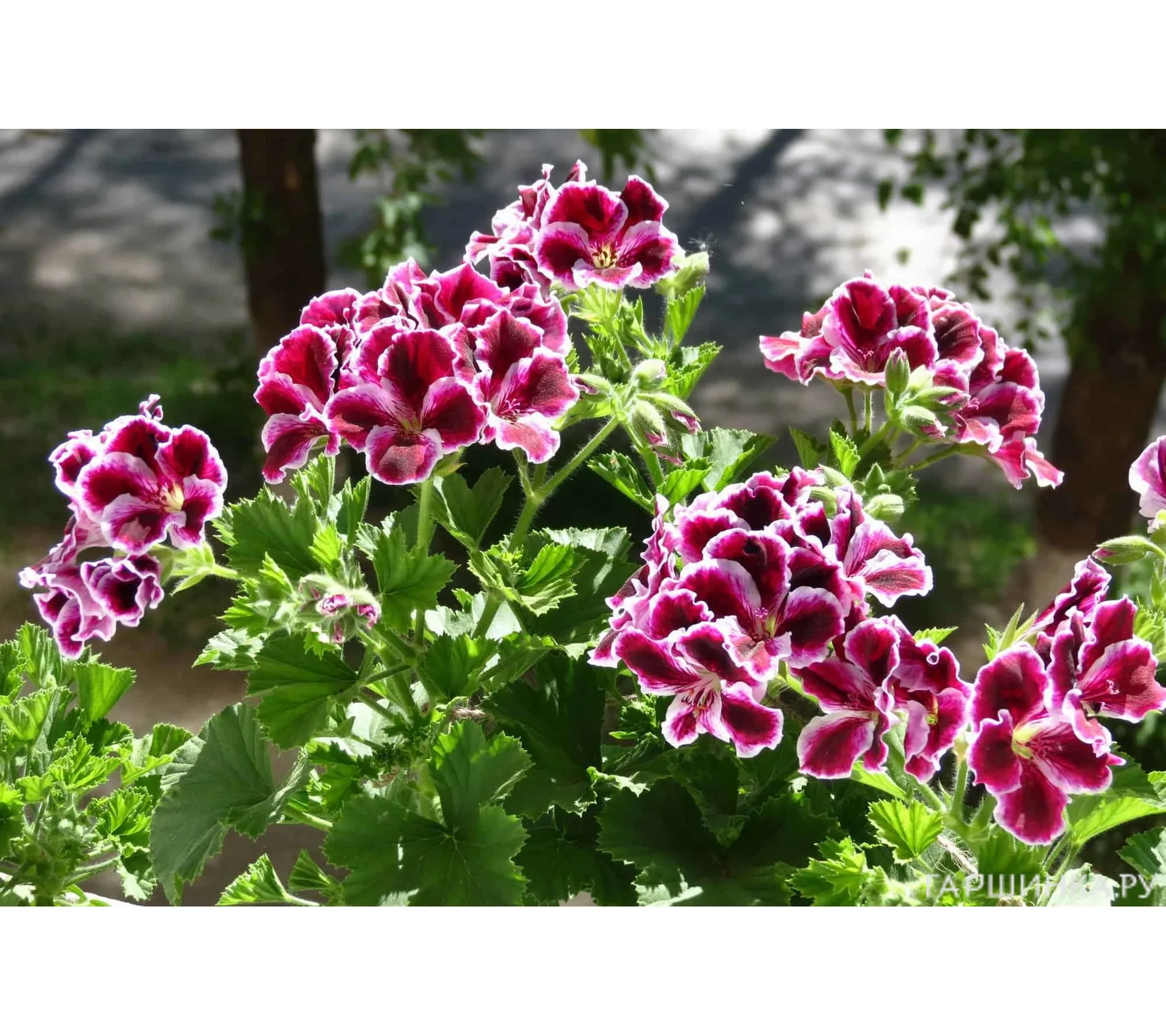Пеларгония королевская БермудаДакРед (BermudaDarkRed).Крупные и сочные вишнёво-красные соцветия с белым горлом и штриховкой. Белоснежная сердцевинка бутона будто бы намекает на хрустальную нежность цветка и деликатность ухода за ним. Волнистые малиновые кромки лепестков озорно топорщатся, как оборки нарядного платья – не поэтому ли при беглом взгляде на цветок возникает радостное чувство предвкушения праздника? Компактный куст славится ранним и продолжительным цветением.
