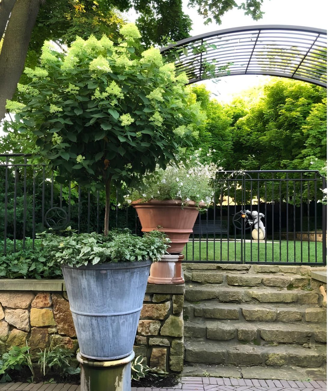 Штамбовая гортензия хорошо смотрится в одиночных посадках, у входа в дом, вдоль дорожек и на газоне. Она легко сочетается с хвойными, декоративными злаками и низкими многолетниками, подчёркивающими форму ствола и кроны.