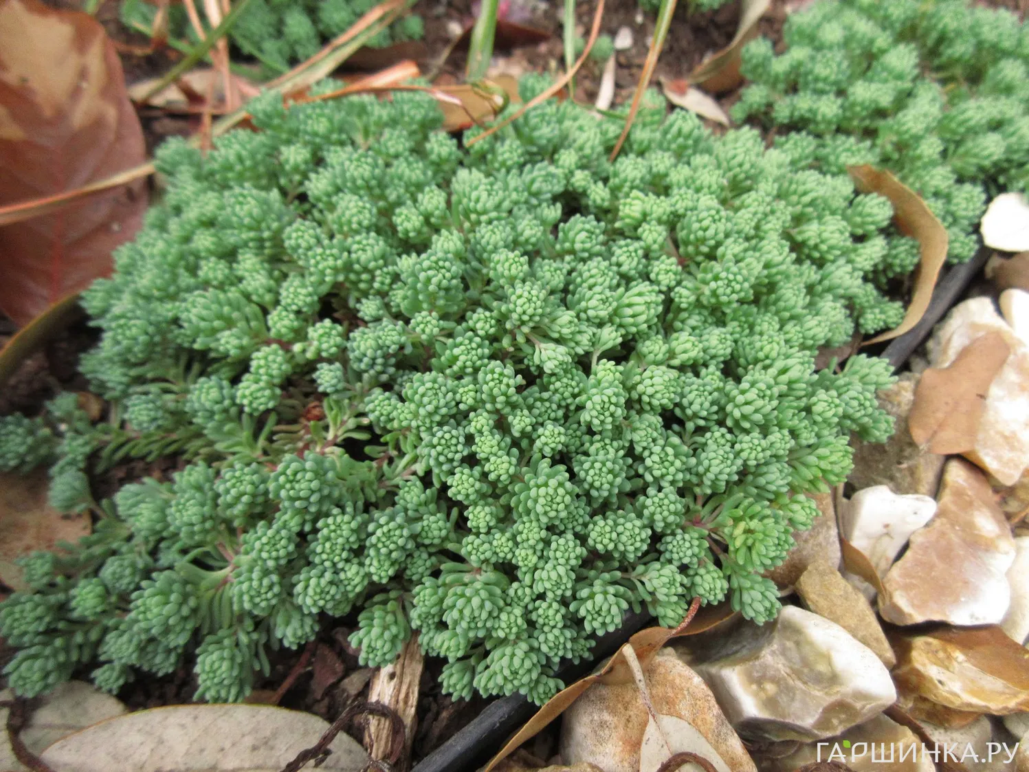 5 – Очиток (седум) Испанский с плотными побегами – многолетнее вечнозеленое растение. Листья маленькие и узкие. Их цвет - зеленовато-розовый. Цветки мелкие и белые. Их особенность - они образованы пятью заостренными лепестками. Этот вид неприхотлив к почве, но плохо переносит ее переувлажнение.