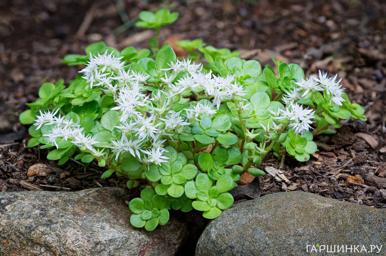 - Очиток белый – цветет в июне красивыми белыми цветками и образует плотные коврики 5-15 см в высоту. Весной и летом листья зеленые, а к осени становятся пурпурными.