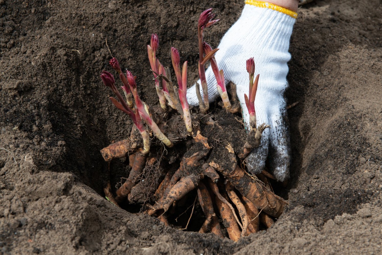 Далее на 2/3 посадочная яма заполняется плодородной почвой, куда добавляются удобрения. Корневище растения следует располагать так, чтобы его почки оказались на уровне в 4-5 см ниже поверхности. В ином случае при более мелкой посадке высок риск того, что почки просто замёрзнут, а при более глубокой — сгниют. Далее корневище присыпают почвенной смесью и уплотняют. Наконец, свежепосаженный пион обильно поливают и мульчируют приствольный круг перегноем либо торфом.