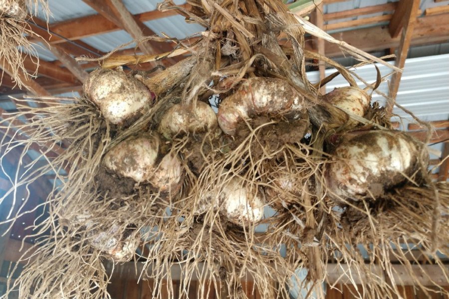 Уборку чеснока лучше проводить в сухую погоду. Растения аккуратно выкапывают вилами или лопатой, стараясь не повредить луковицы. Если почва сухая, чеснок можно просто выдернуть, взявшись за основание листьев. После выкапывания растения отряхивают от земли, но не моют водой. Листья и корни оставляют на растениях. Выкопанный чеснок раскладывают для просушки в тени или под навесом на 1-2 недели. При этом важно обеспечить хорошую вентиляцию. Если погода дождливая, сушку проводят в хорошо проветриваемом помещении. После просушки обрезают корни, оставляя пенек длиной 1-2 см, и удаляют листья, если не планируется хранение в виде плетенок.