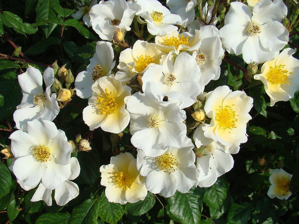 - Роза Нэж д'Этэ, Ленс – снежно-белые цветы с желтыми тычинками создают контраст с насыщенной листвой. Куст, устойчивый к заболеваниям, что способствует продолжительному цветению.
