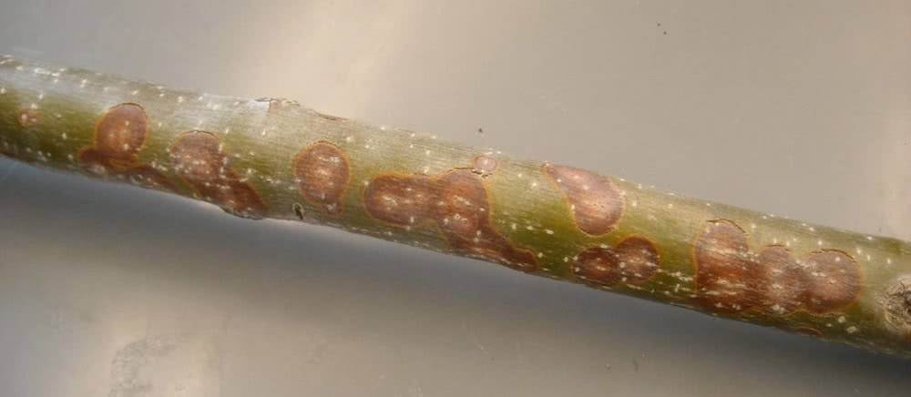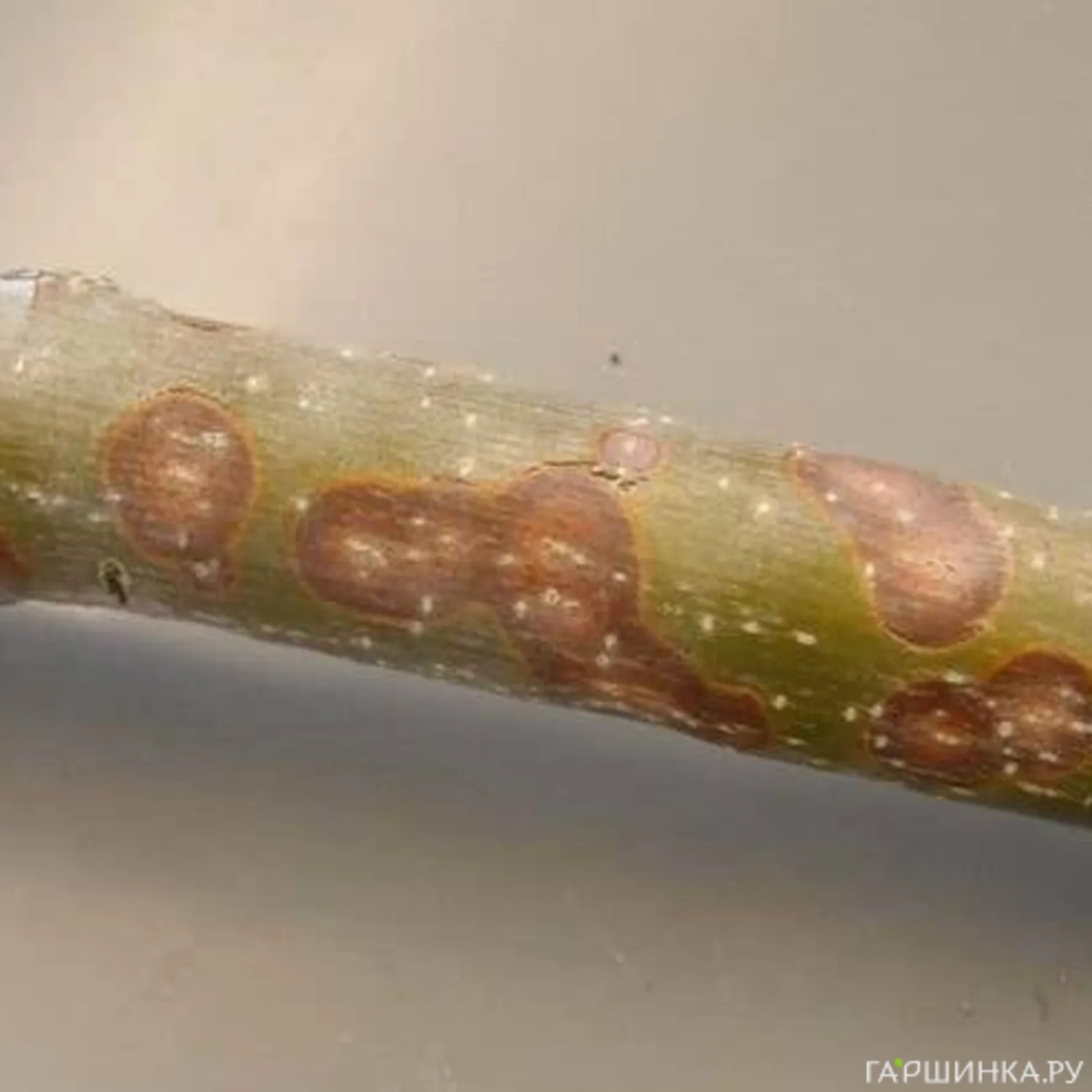 Пятнистости листьев. Характерно появление на листьях и побегах бурых или красно-бурых расплывчатых пятен, на которых может образовываться серый налет. На границе здоровой и отмершей ткани, чаще всего, имеется характерная желтая полоса. Поврежденные листья преждевременно опадают, побеги буреют и загнивают. Бутоны отмирают на стадии завязи.