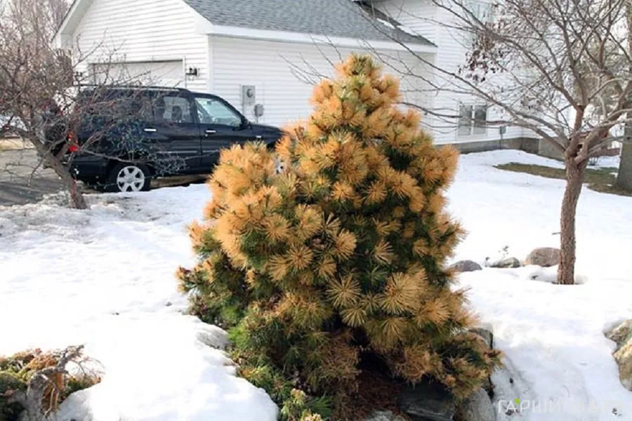 Причины тому очень простые. Уже с конца февраля яркое солнышко пробуждает фотосинтетические процессы в зеленой хвое. Спящая до этого времени она оживает и требует влаги, но корни растения находятся в промерзшей почве и не могут добыть ее. В результате хвоинки обезвоживаются и желтеют.