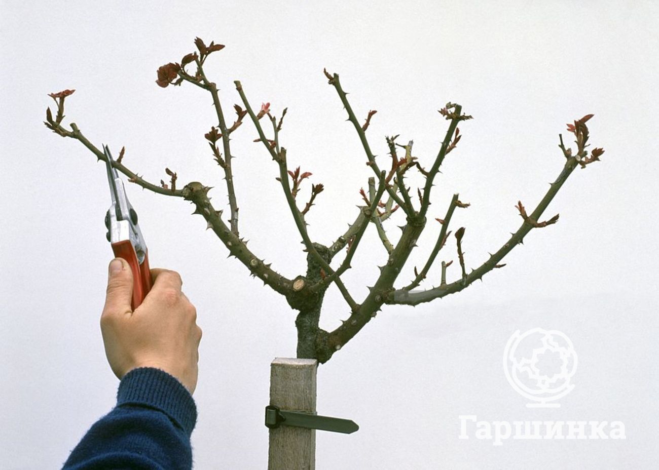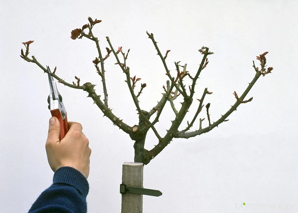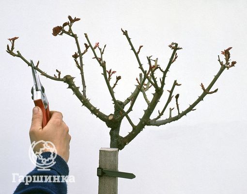 На заданной высоте производят прививку, обычно способом окулировки. Прививают сразу 2-4 глазка, чтобы крона была равномерно округлой. Для прививки можно использовать один или разные сорта роз с одинаковыми формами роста.