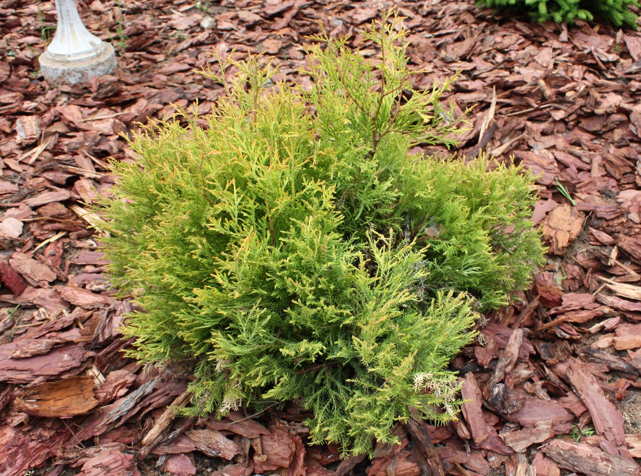 Грунт в приствольном круге свежепосаженного растения обычно проседает после обильного полива, и образовавшуюся выемку рекомендуется выложить мульчой. Важно проконтролировать, чтобы древесные опилки, опавшая листва или щепки не прилегали к стволу вплотную и не засыпали нижние ветви во избежание их гибели в результате прения.