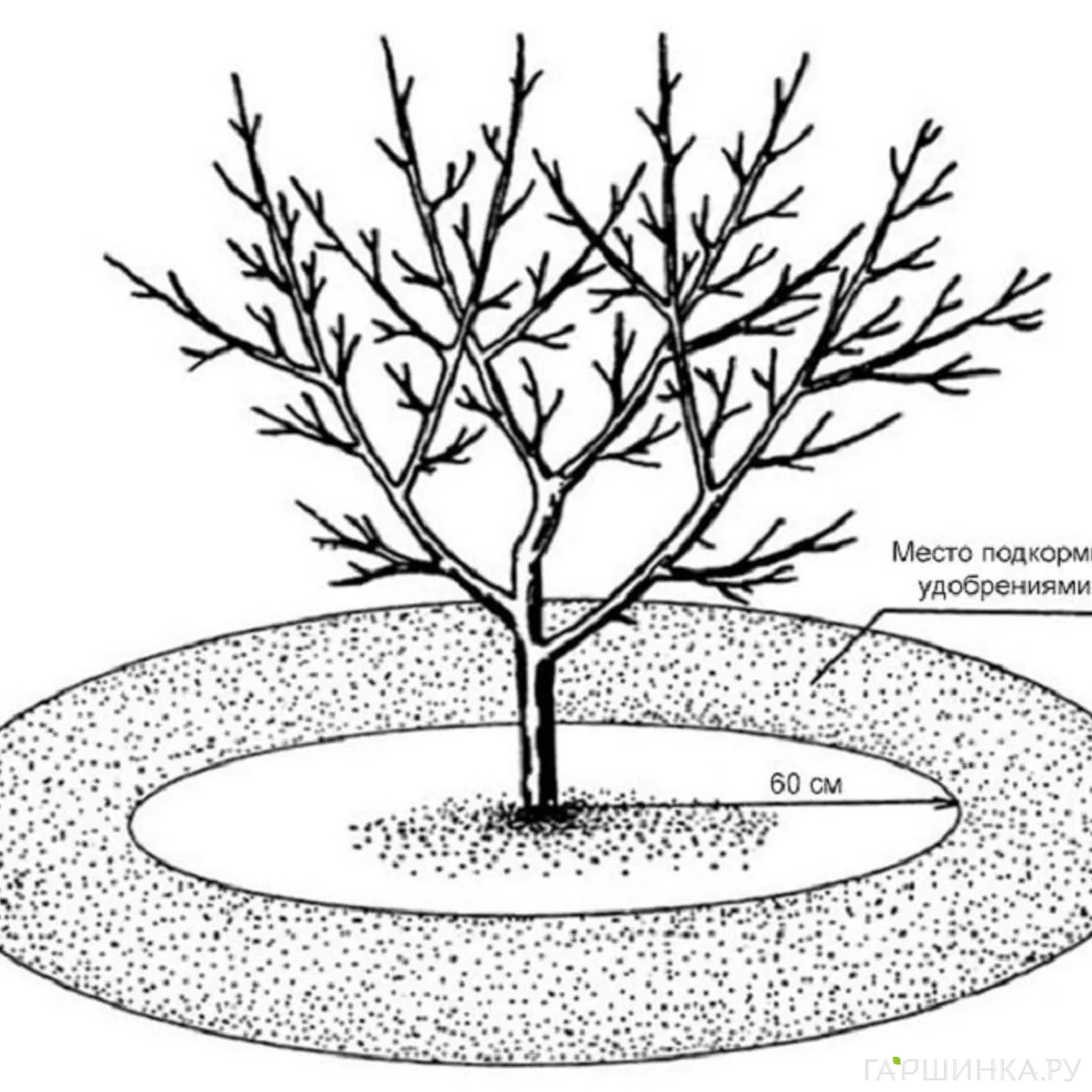 - В начале цветения проводят вторую подкормку. Если стоит жаркая сухая погода, ее дают в жидком виде: берут 1 кг суперфосфата, 800 г сернокислого калия, 500 г мочевины. Разводят в 200 л бочке, на одно дерево расходуют 40-50 л раствора. Поливают так же в круг, обозначенный на рисунке выше. Перед подкормкой почву обязательно поливают водой, затем подкармливают и снова поливают. Тогда подкормка будет надежной.