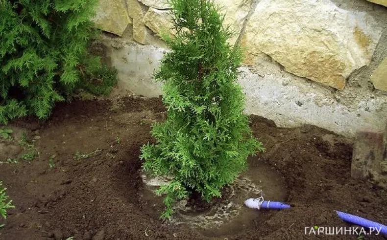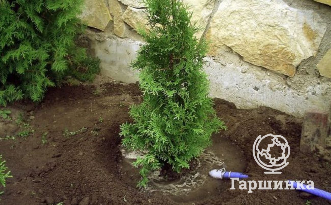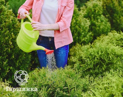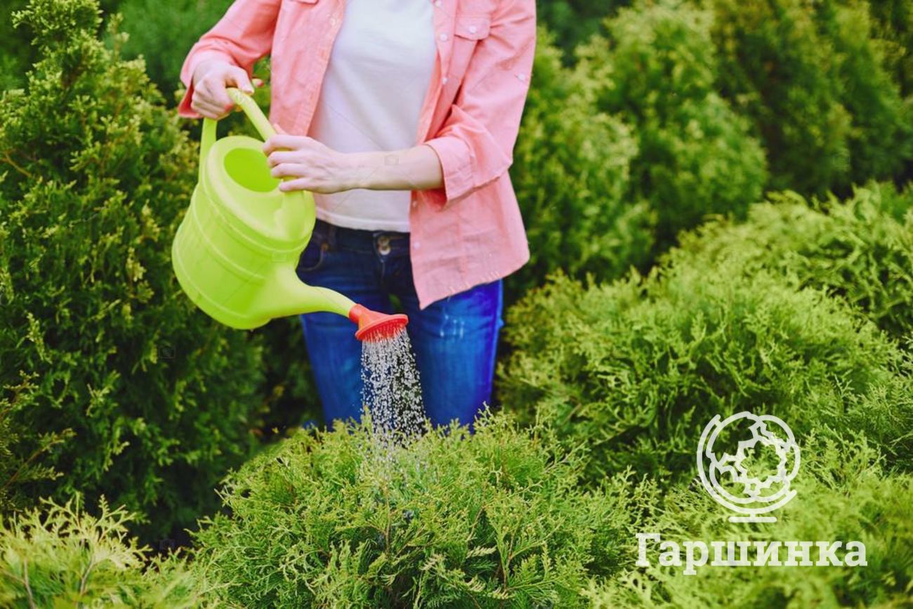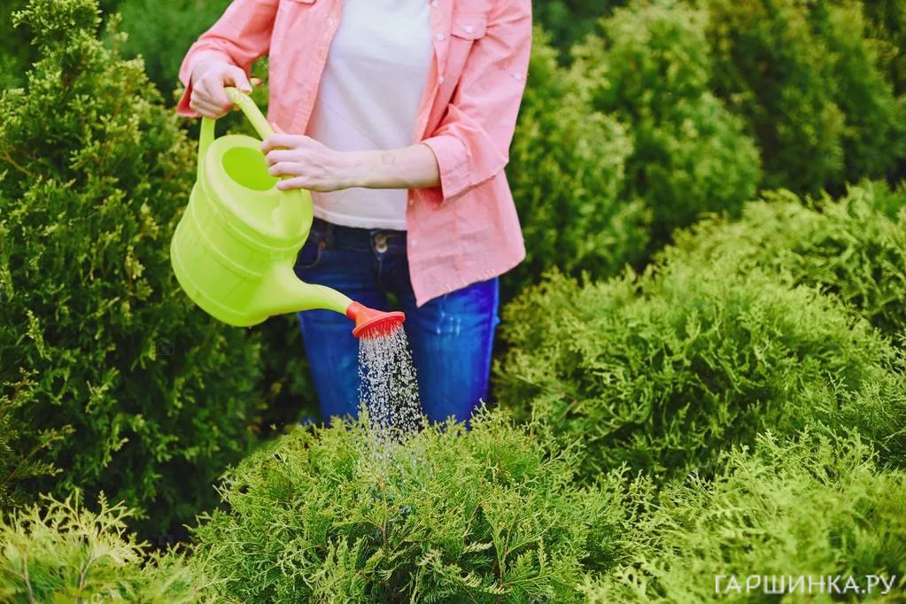 Кроме того, весной туям крайне необходим полив: раз в неделю в теплые дни, два раза — в жаркую сухую погоду. Под каждое молодое деревце необходимо выливать минимум по ведру воды, в засуху — два; под взрослые растения расход воды увеличивается вдвое.