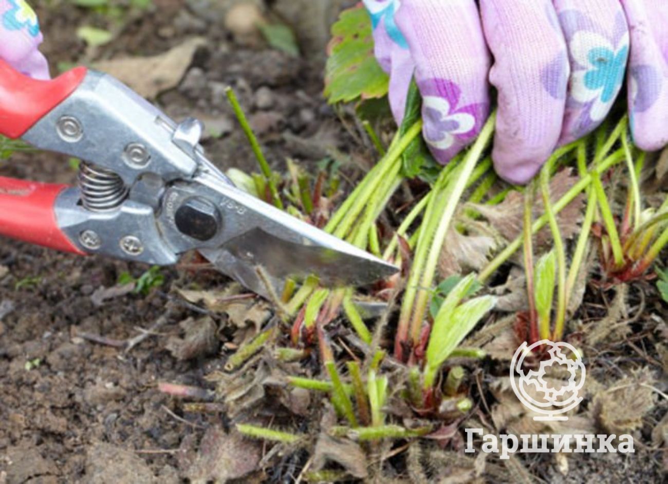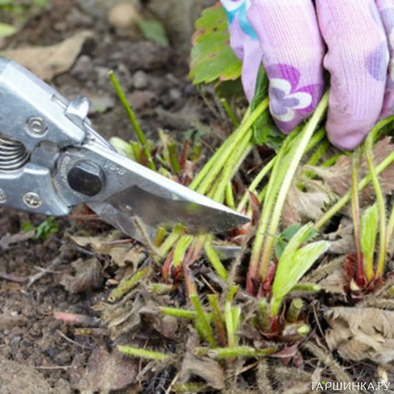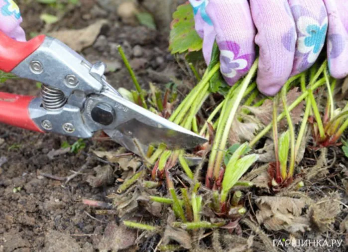 После схода снега уберите мульчу, соберите все сухие листья и обрежьте прошлогодние, особенно поврежденные заболеваниями; ненужные усы также удалите. На каждом кустике оставьте только молодые зеленые листочки. Обрезку проводите аккуратно, чтобы не повредить молодые листочки и точку роста. Сердечко должно слегка возвышаться над землей, буквально на несколько миллиметров.