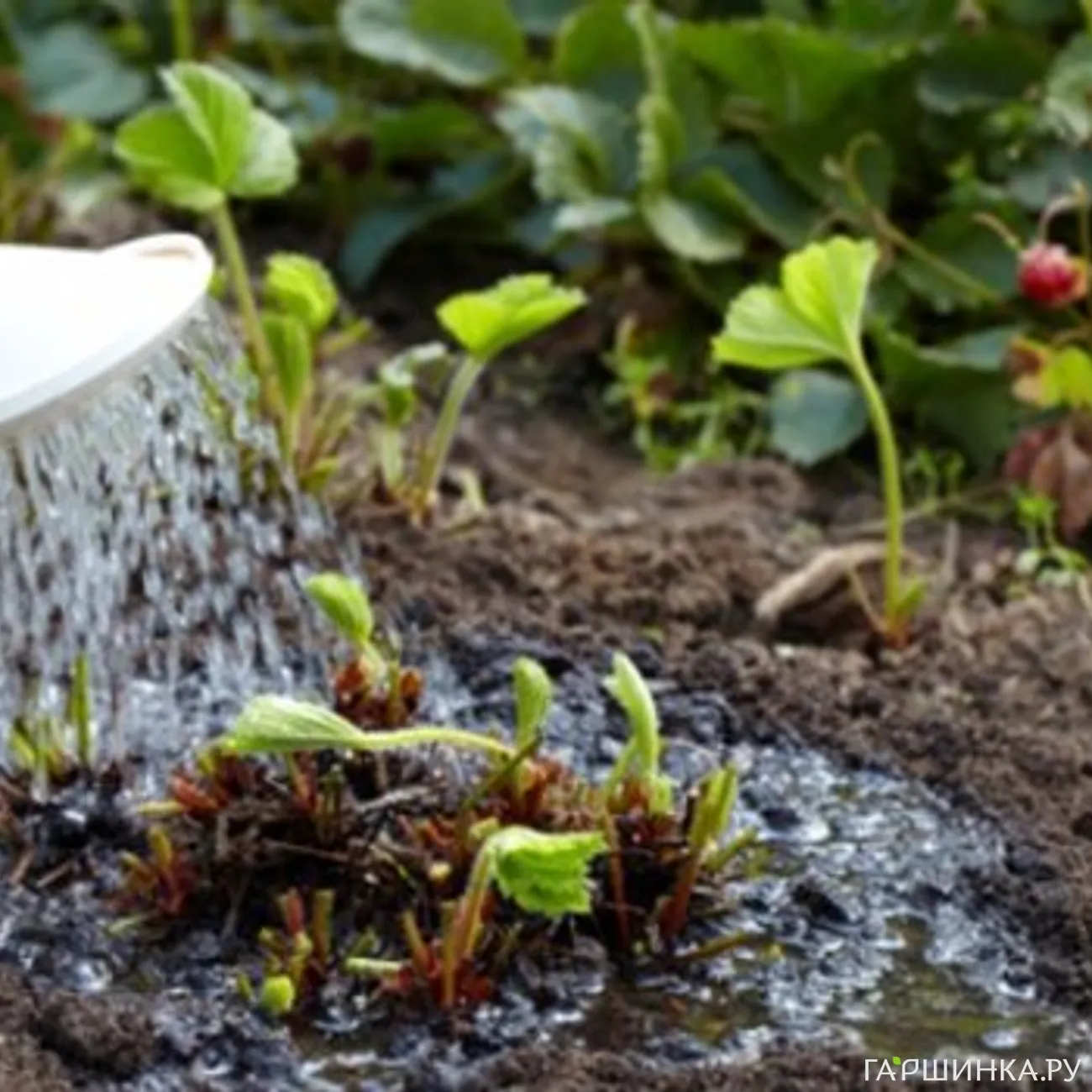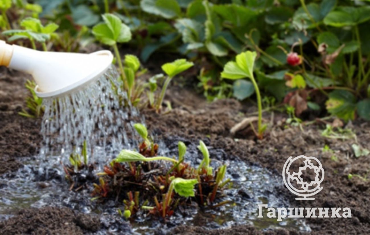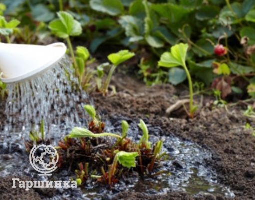 Полив — важная операция в уходе за клубникой, которая сказывается и на количестве и на качестве урожая. Весной, в период отрастания листьев, земляника отзывчива на дождевание. Перед цветением, особенно, если стоит жаркая сухая погода, растения необходимо обильно полить. Далее в течение сезона полив проводим по мере необходимости.