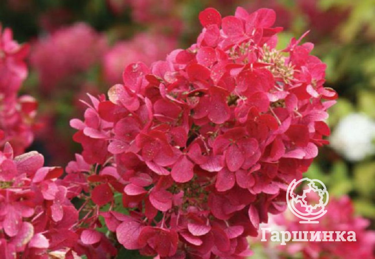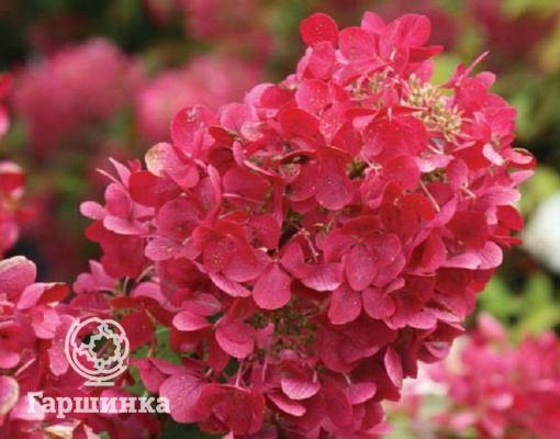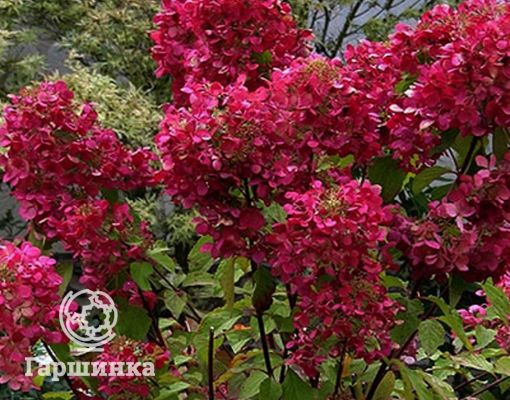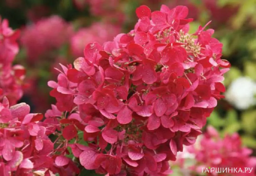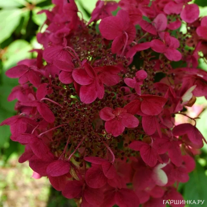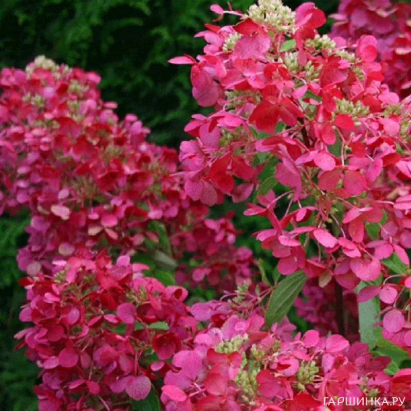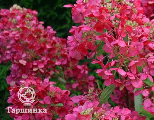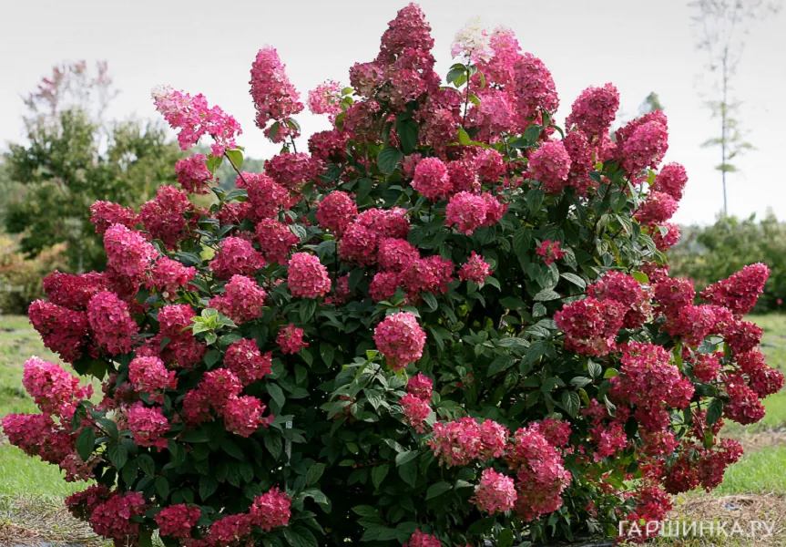 Сорт Даймонд Руж (Diamond Rouge) – компактный куст до 1,5 м высотой. Соцветия очень крупные, многочисленные, в начале цветения они белые, затем стремительно розовеют, а после приобретают интенсивный красный цвет. Эта гортензия высоко зимостойка, зимует без укрытия.