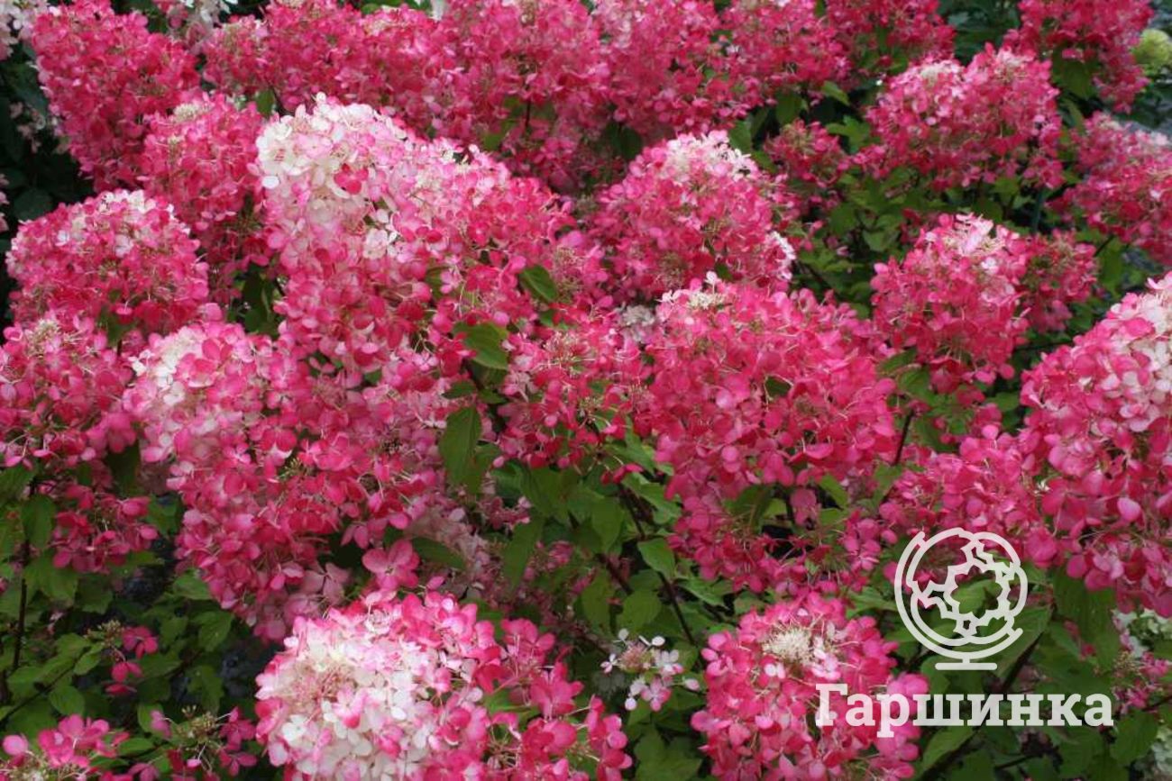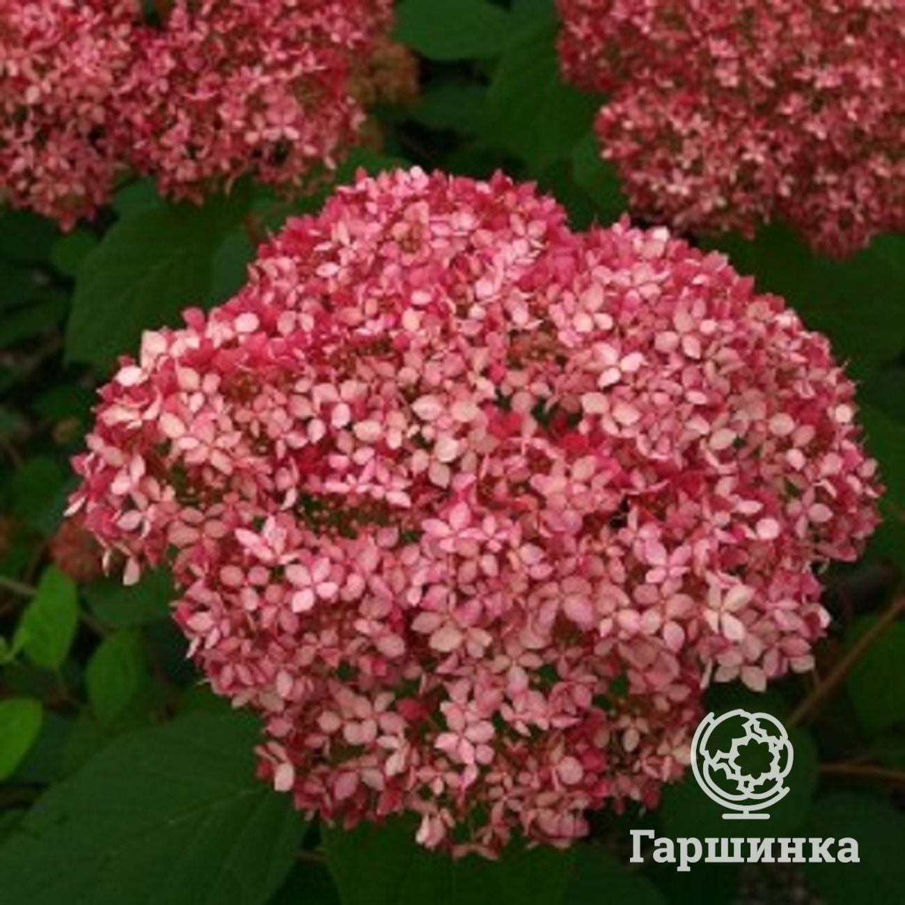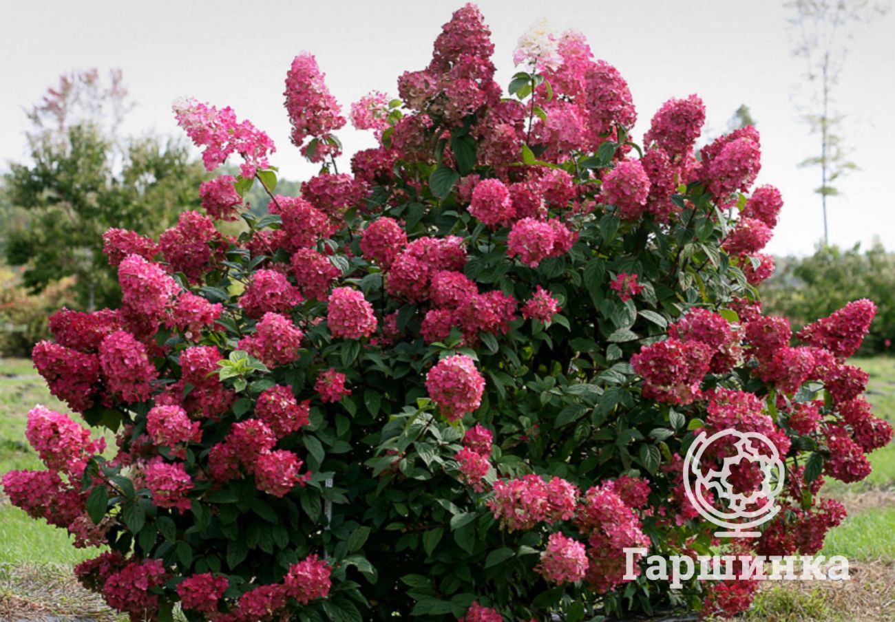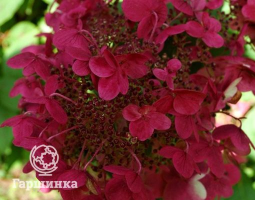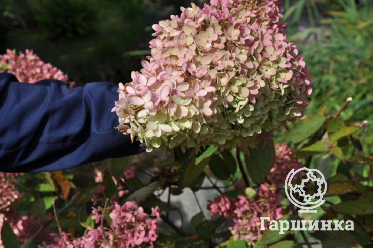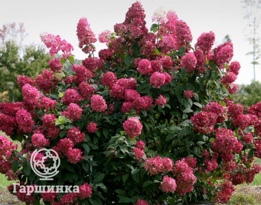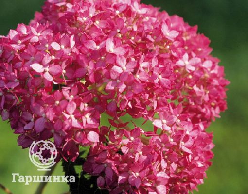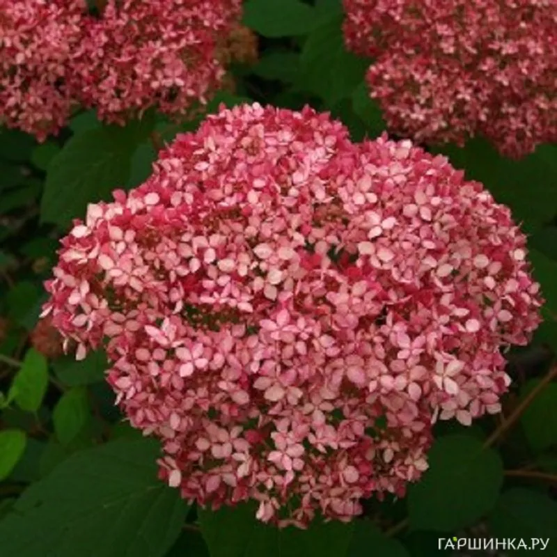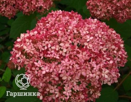 Гортензия древовидная Пинк Пинкэссайэн (Pink Pincussion) – кустарник высотой до 120 см, формирует куполообразные соцветия около 10 см в диаметре, цветки мелкие розовато-красные. Выдерживает морозы до -29 °С.