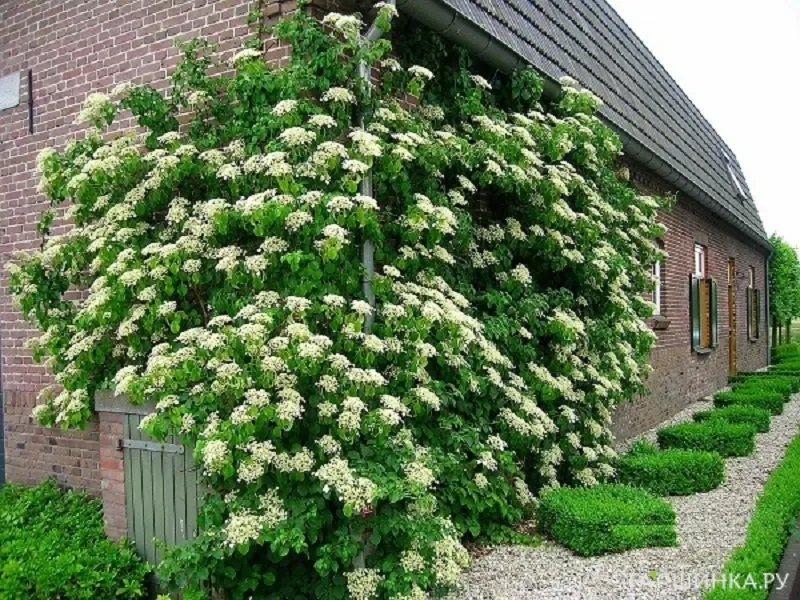 Например, гортензия черешковая или лазящая. Это лиана до 25 м длиной. Она подходит для выращивания в регионах с мягкими зимами. В условиях средней полосы может использоваться как почвопокровное растение, либо как лиана, но при условии снятия с опоры и дополнительного укрытия на зиму.