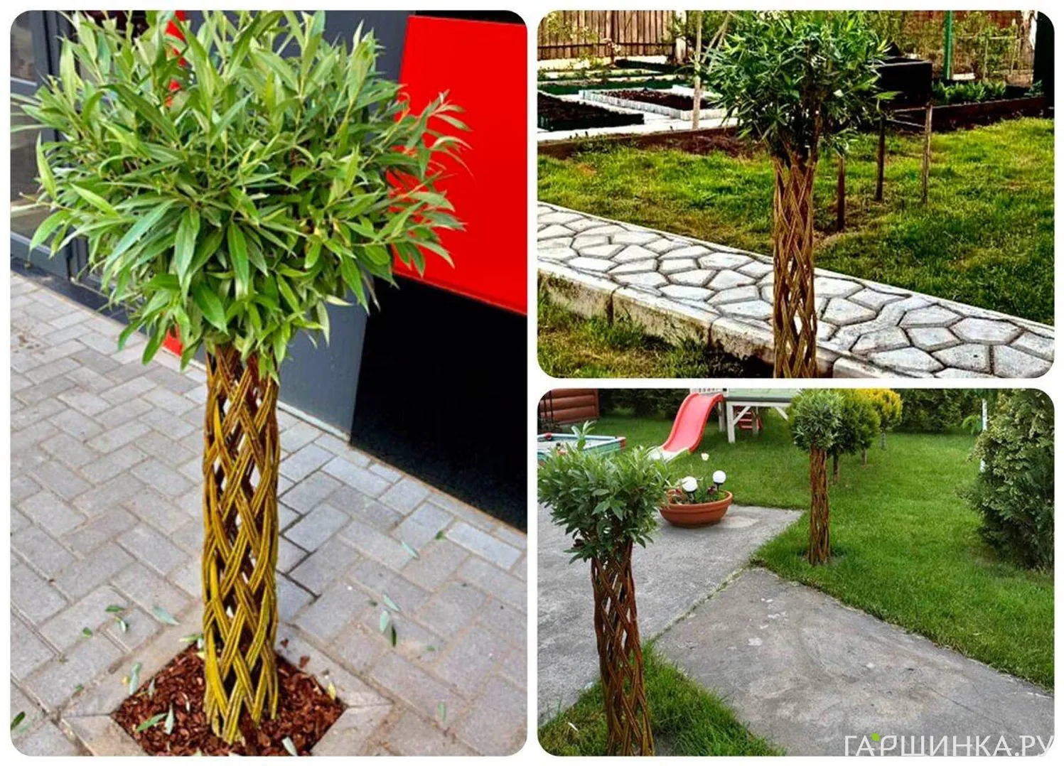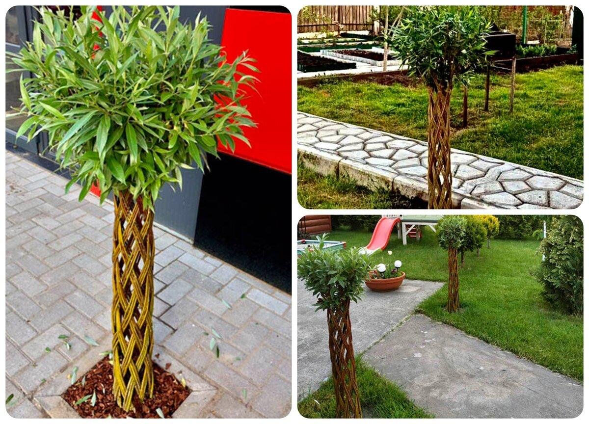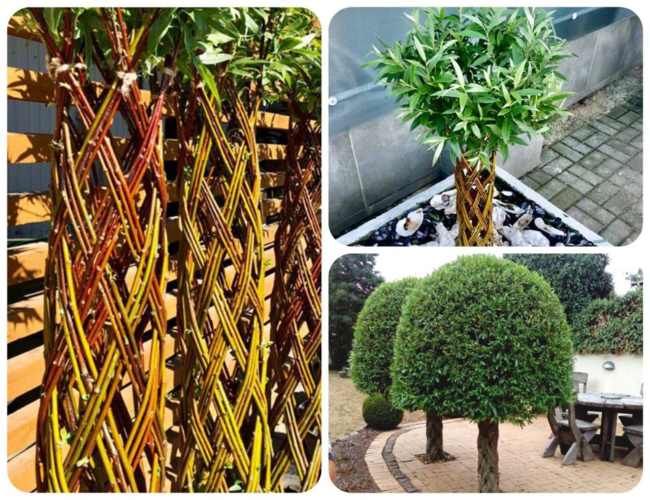 Плетёные деревья давно стали популярными как в природных садах, так и в декоративных композициях у входных групп. Такие деревья формируются из нескольких тонких саженцев ивы, высаженных рядом. Побеги переплетают, создавая узор: спираль, косу, решётку или свободную форму. Через один-два года ствол становится единым, потому что ива прекрасно срастается в местах соприкосновения коры.
