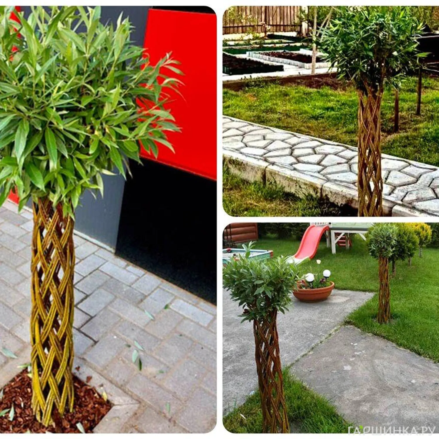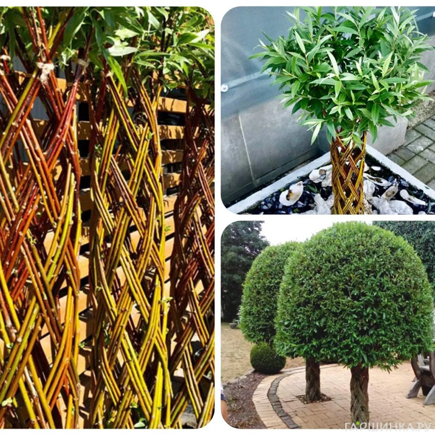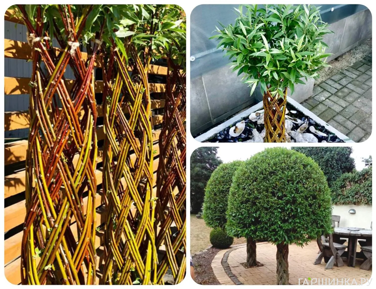 Плетёные деревья давно стали популярными как в природных садах, так и в декоративных композициях у входных групп. Такие деревья формируются из нескольких тонких саженцев ивы, высаженных рядом. Побеги переплетают, создавая узор: спираль, косу, решётку или свободную форму. Через один-два года ствол становится единым, потому что ива прекрасно срастается в местах соприкосновения коры.