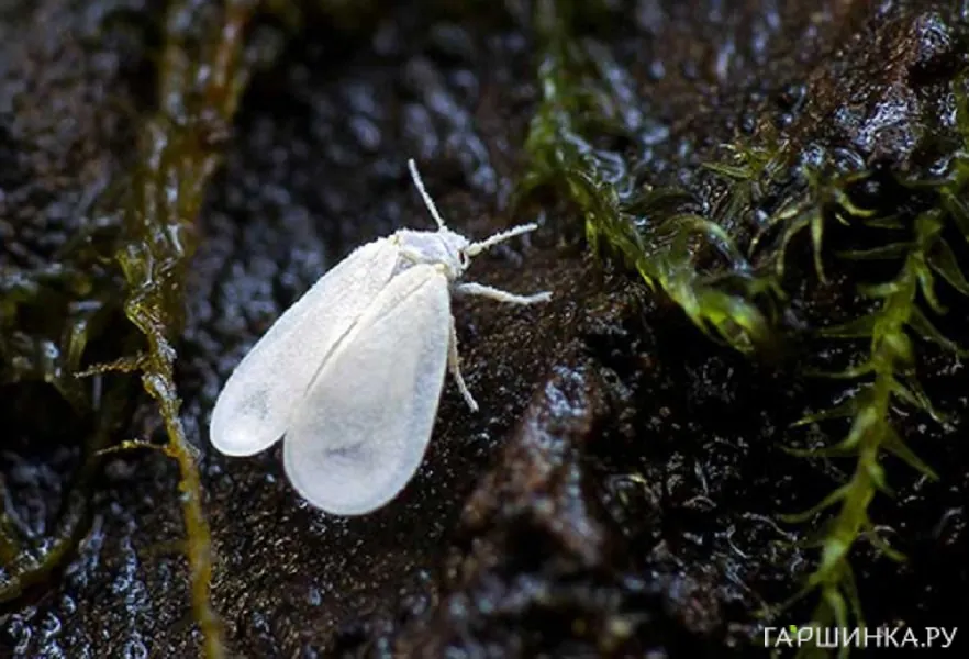 БЕЛОКРЫЛКА. Наиболее распространенный вредитель тепличных культур. Вред наносят личинки, откладываемые самками на обратной стороне листьев (высасывают сок).