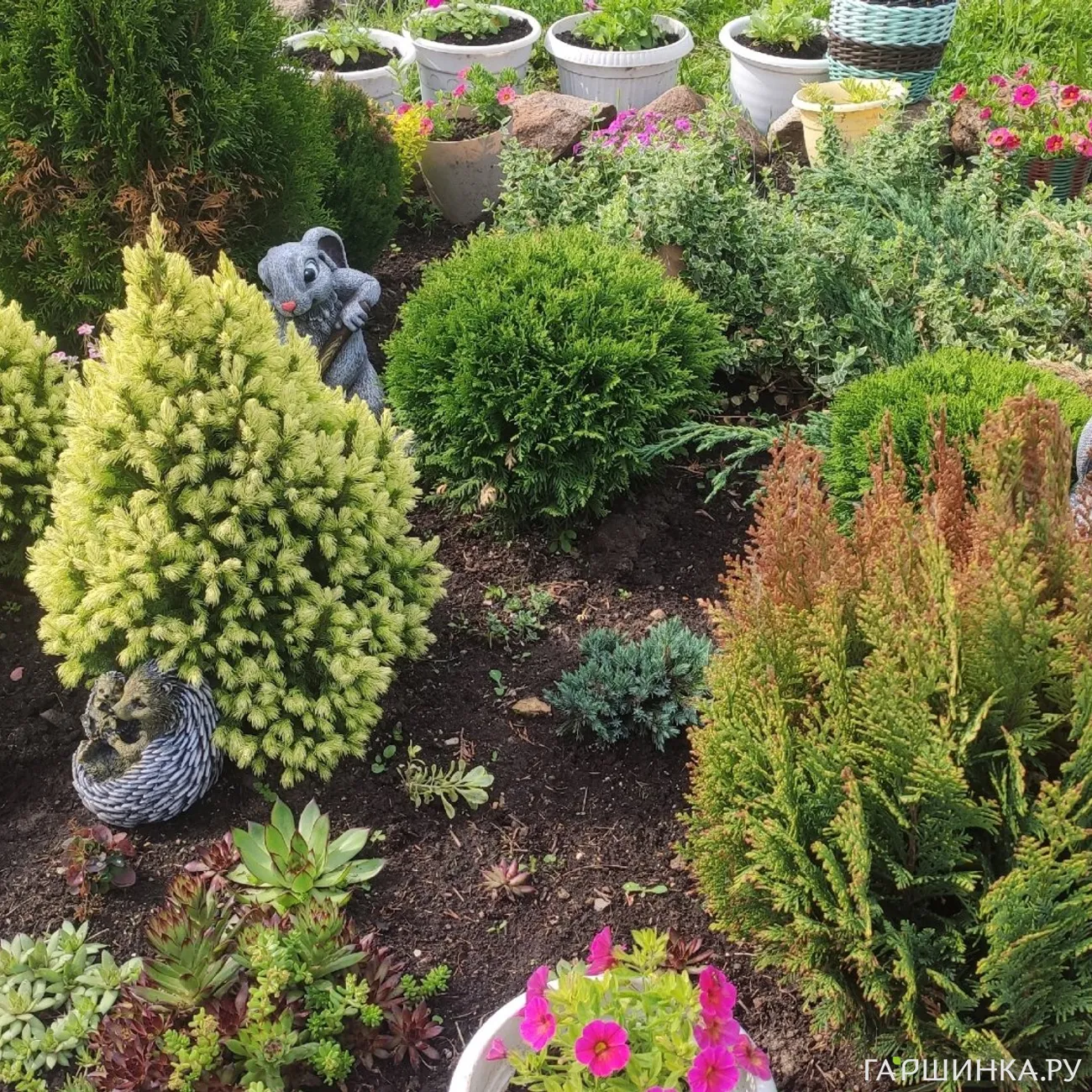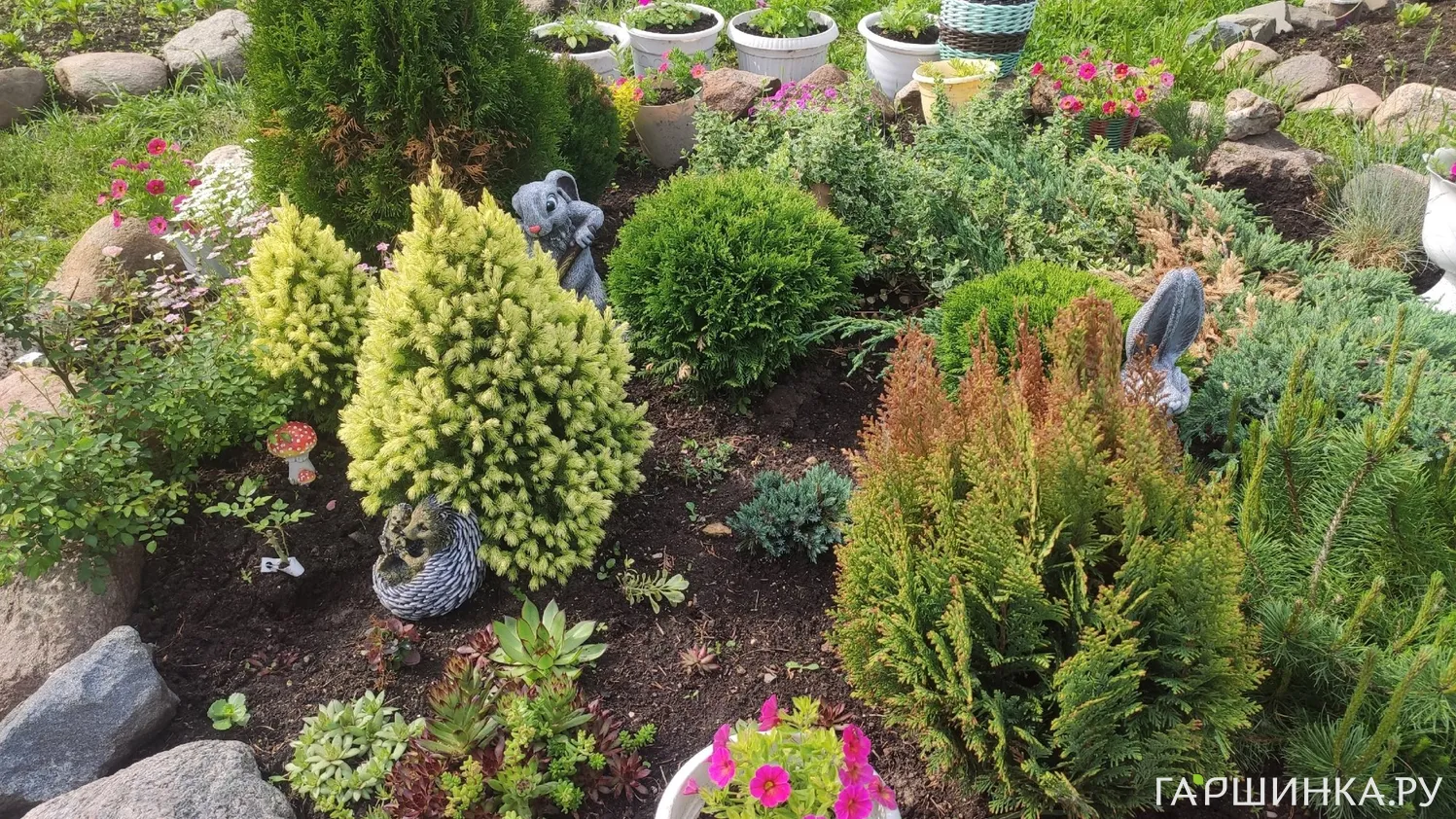 Я участвую в конкурсе цветущих садов. Сейчас зацветают розы и пионы, но их выложу отдельно. А самая любимая клумба на нашем участке, это клумба с хвойными растениями из Гаршинки, а вокруг нее кашпо с петуньями и калиброхоа,а также другие клумбы с разными цветами.