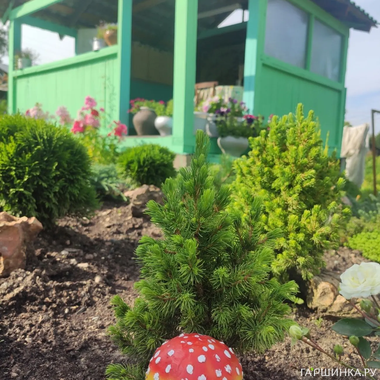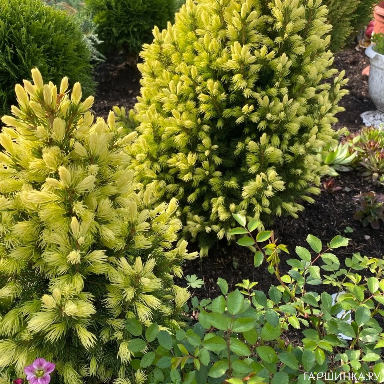 На хвойной клумбе у нас с дочкой растут туя Даника, туя Смарагд, ель Коника, туя Тедди, бересклет Форчуна, сосна горная Пумиллио, две туи забыла название, можжевельник блю карпет голубой, можжевельник блю стар, барбарис Нана самшитолистный. И хоть хвойные и не цветут, но очень красивые, в промежутки посажены розочки спрей, мини хосты и другие цветы.