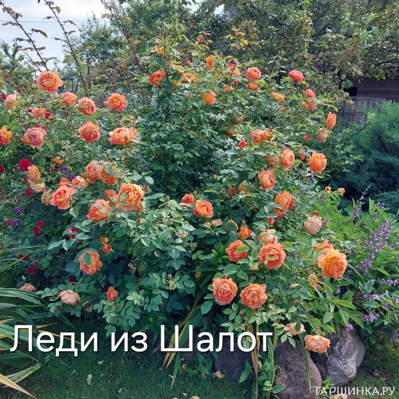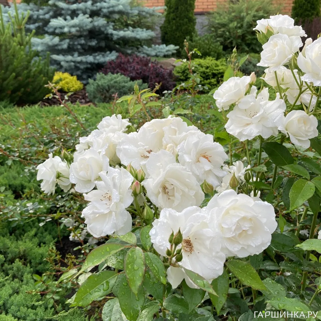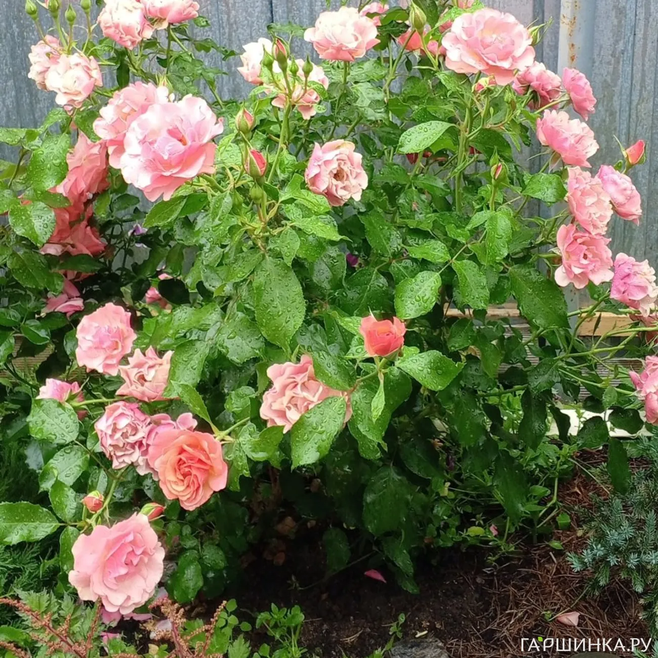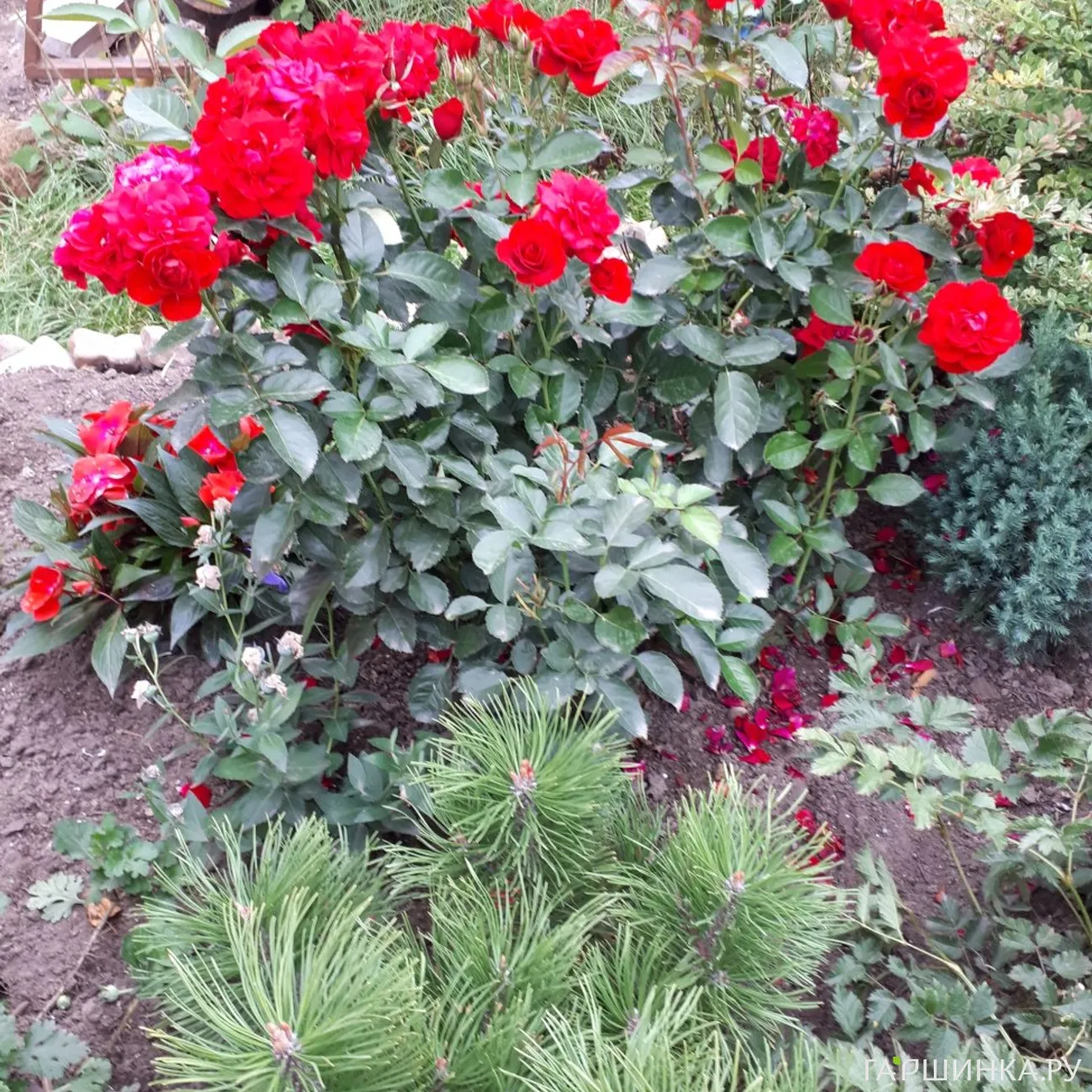Куст устойчив к заболеваниям, к дождю и жаре, прекрасно зимует (у меня все розы под укрытием зимуют).В ногах у роз посажены два можжевельника: Блю Стар и Андорра Компакта.